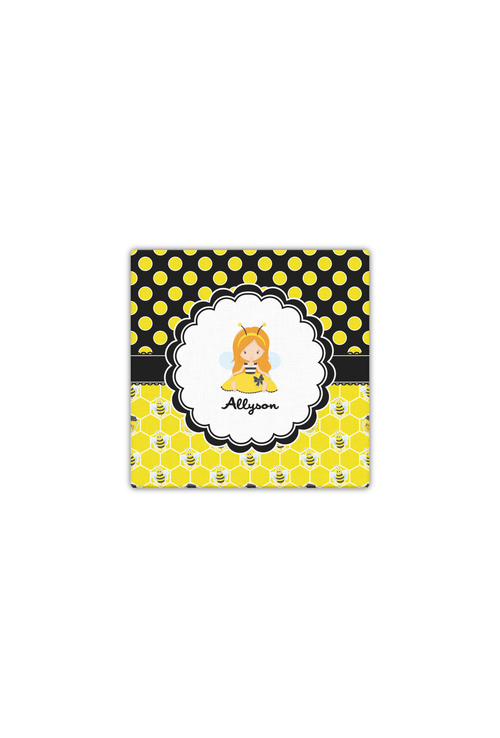 A wide lace black ribbon separates the pattern and connects a beautiful black trimmed white decorative label that provides a focal point for either a little bumble-bee or a bumble-bee obsessed girl and his/her name. As a special touch, personalize your little bumble-bee girl's hair and skin color.