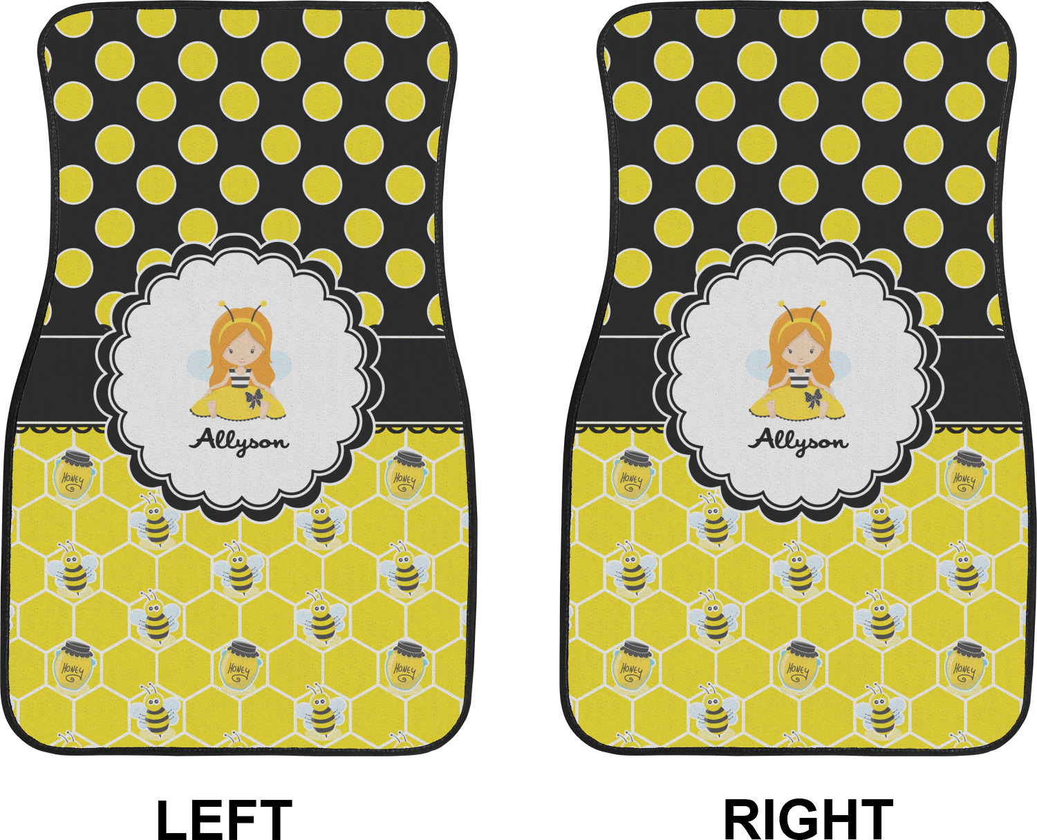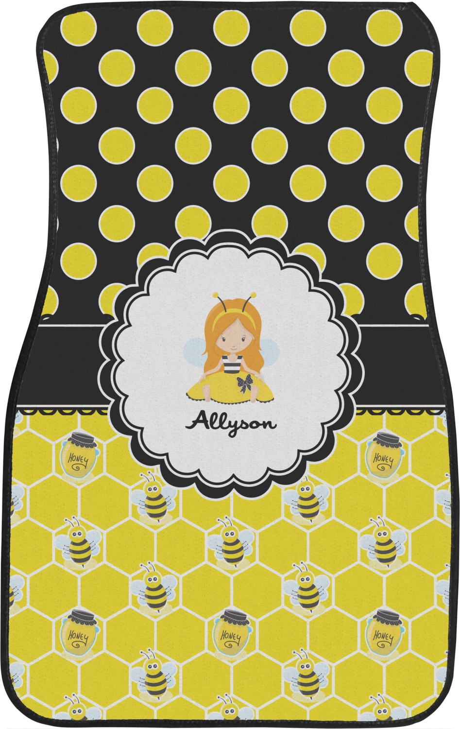 A wide lace black ribbon separates the pattern and connects a beautiful black trimmed white decorative label that provides a focal point for either a little bumble-bee or a bumble-bee obsessed girl and his/her name. As a special touch, personalize your little bumble-bee girl's hair and skin color.