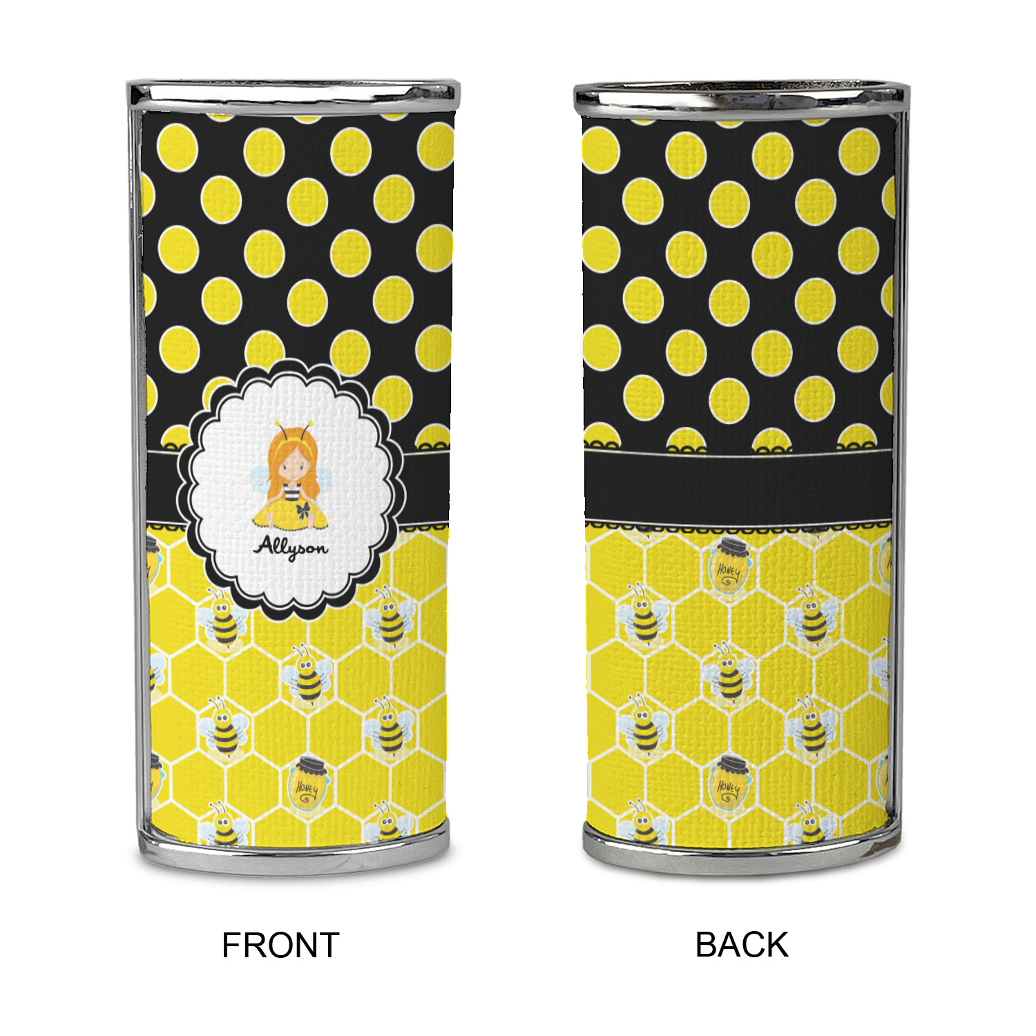 A wide lace black ribbon separates the pattern and connects a beautiful black trimmed white decorative label that provides a focal point for either a little bumble-bee or a bumble-bee obsessed girl and his/her name. As a special touch, personalize your little bumble-bee girl's hair and skin color.