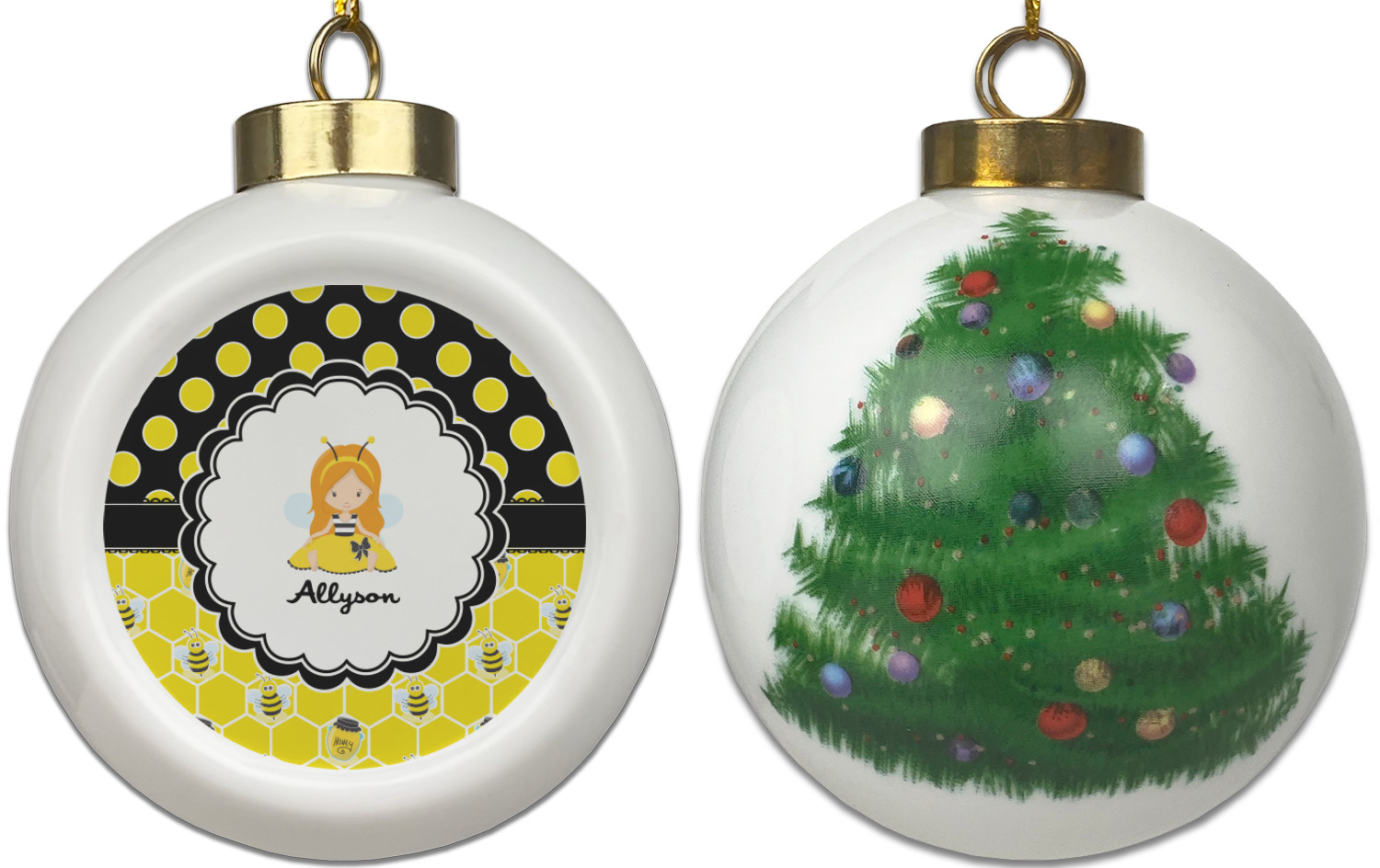Our Christmas ornaments are a unique ceramic ball shape with a twist as it has a flat face to display your custom design! Select from one of our two design types - Christmas Tree or Poinsettia Garland - to adorn the curved back of your personal design. Each ornament measures 3H x 2.5W x 2D accompanied with a gold string accent for finishing touches to hang on your beautiful Christmas tree!