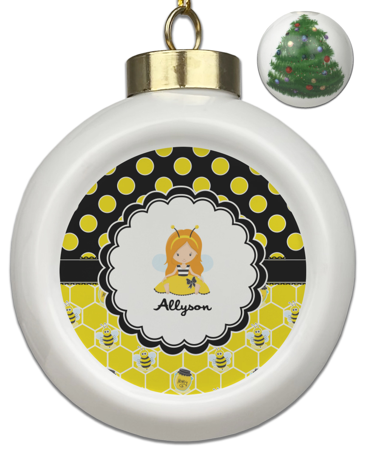 A wide lace black ribbon separates the pattern and connects a beautiful black trimmed white decorative label that provides a focal point for either a little bumble-bee or a bumble-bee obsessed girl and his/her name. As a special touch, personalize your little bumble-bee girl's hair and skin color.