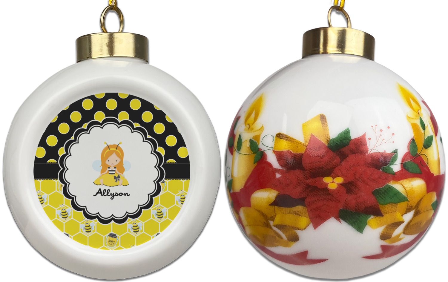 Our Christmas ornaments are a unique ceramic ball shape with a twist as it has a flat face to display your custom design! Select from one of our two design types - Christmas Tree or Poinsettia Garland - to adorn the curved back of your personal design. Each ornament measures 3H x 2.5W x 2D accompanied with a gold string accent for finishing touches to hang on your beautiful Christmas tree!