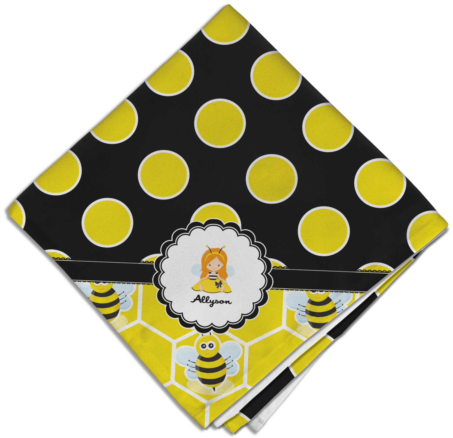 A wide lace black ribbon separates the pattern and connects a beautiful black trimmed white decorative label that provides a focal point for either a little bumble-bee or a bumble-bee obsessed girl and his/her name. As a special touch, personalize your little bumble-bee girl's hair and skin color.