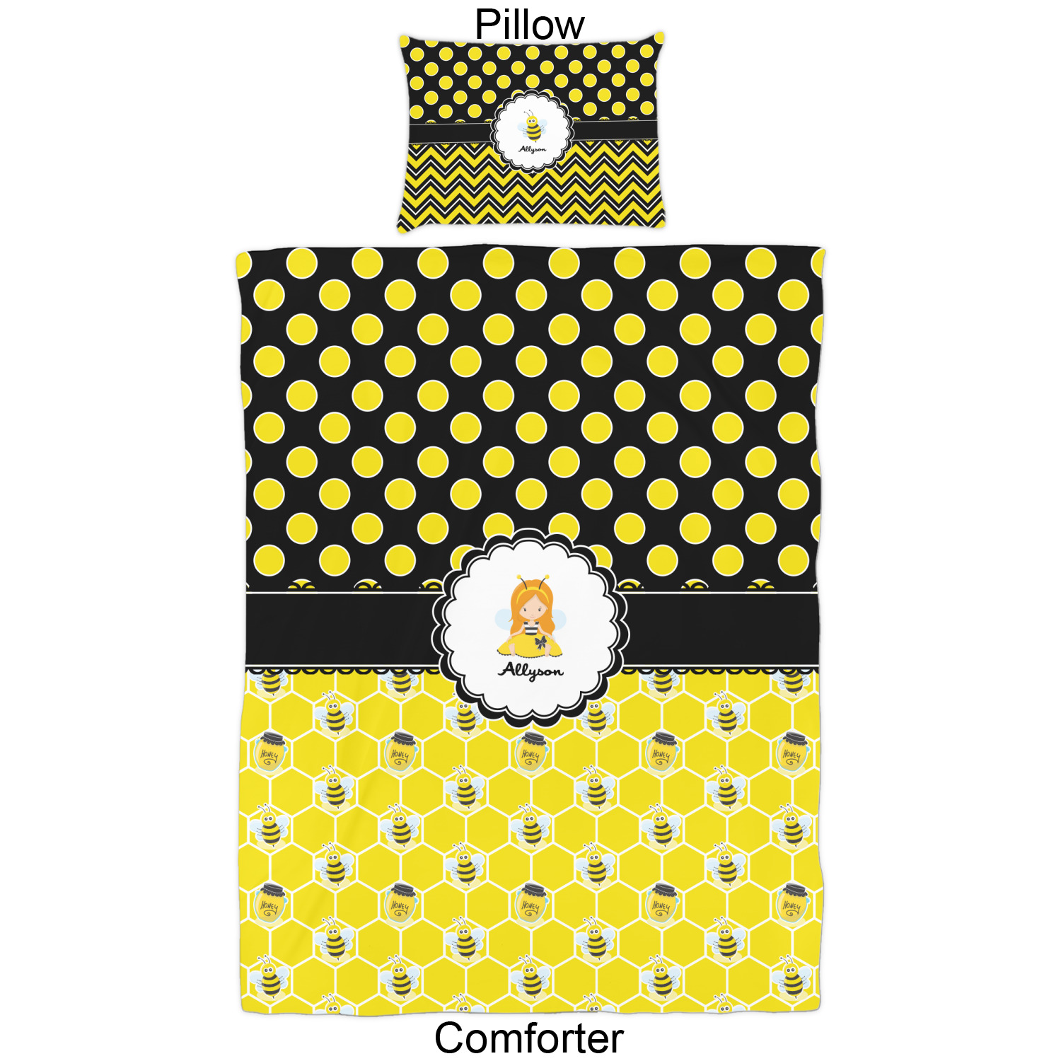 A wide lace black ribbon separates the pattern and connects a beautiful black trimmed white decorative label that provides a focal point for either a little bumble-bee or a bumble-bee obsessed girl and his/her name. As a special touch, personalize your little bumble-bee girl's hair and skin color.