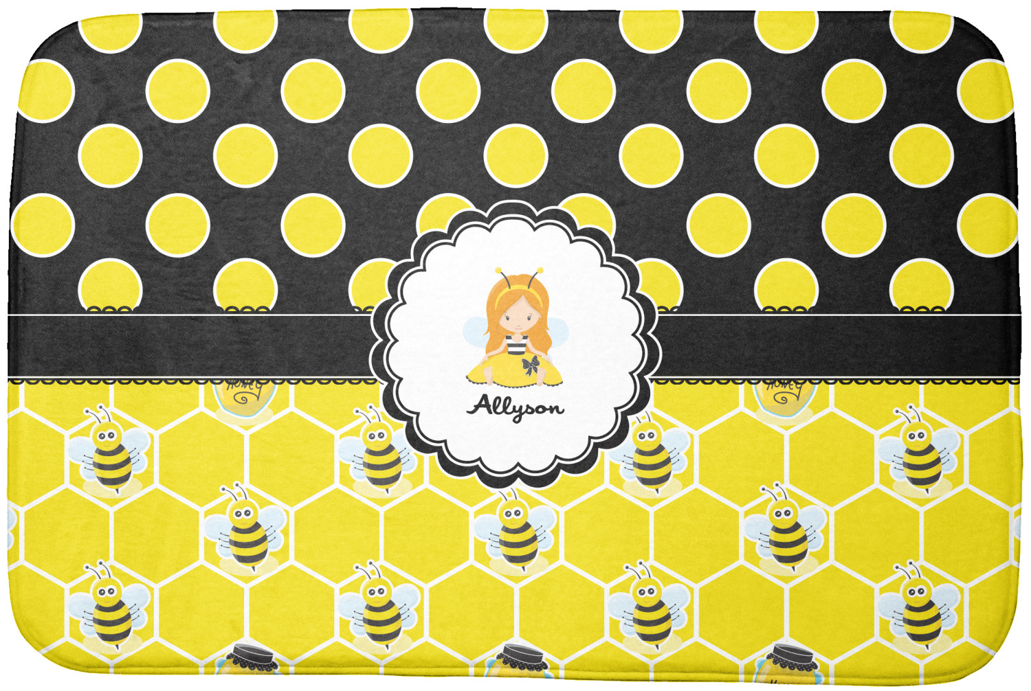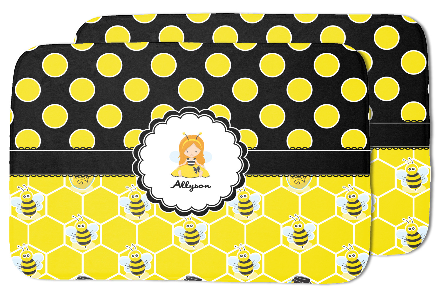 A wide lace black ribbon separates the pattern and connects a beautiful black trimmed white decorative label that provides a focal point for either a little bumble-bee or a bumble-bee obsessed girl and his/her name. As a special touch, personalize your little bumble-bee girl's hair and skin color.
