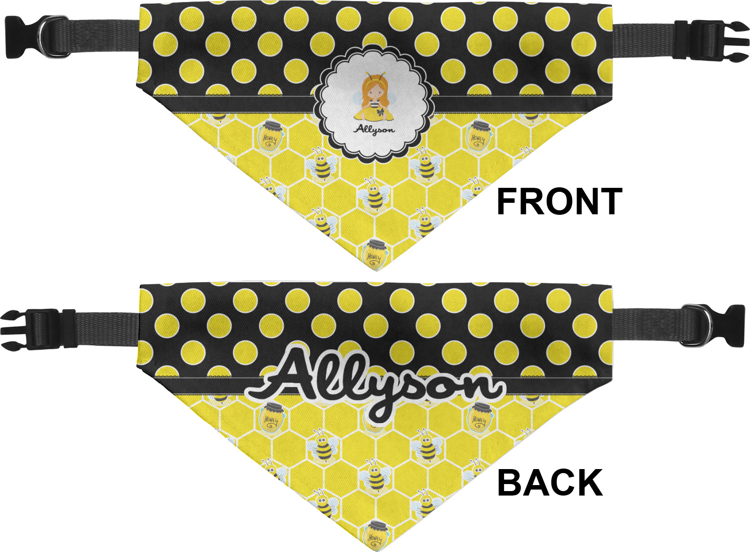 We print the front and back of these dog bandanas with your customized design. The bandana itself is made from a durable polyester, sewn together with a gap large enough to accommodate any collar. Regardless, the bandana includes a plain black, canvas collar with plastic snaps, that can easily be removed if desired. These dog bandana collars are available in four sizes: small, medium, large, and extra large. Please see our sizing chart for more information regarding the dimensions of each size.