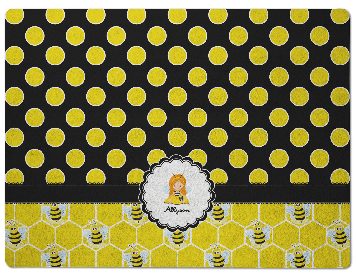 A wide lace black ribbon separates the pattern and connects a beautiful black trimmed white decorative label that provides a focal point for either a little bumble-bee or a bumble-bee obsessed girl and his/her name. As a special touch, personalize your little bumble-bee girl's hair and skin color.