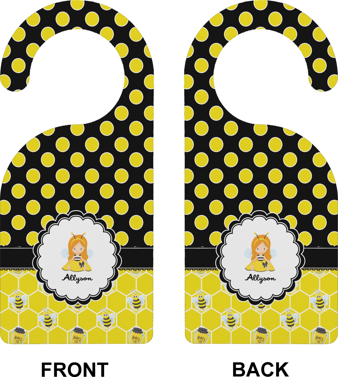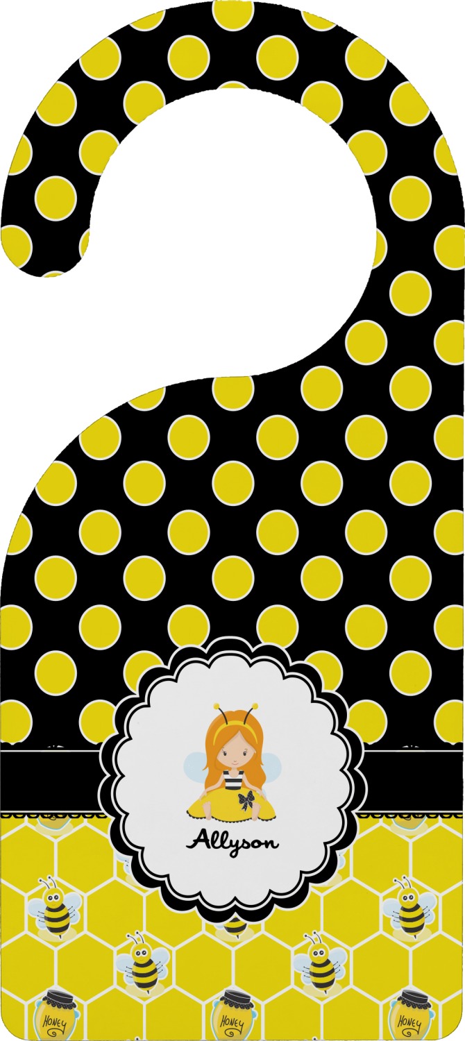 A wide lace black ribbon separates the pattern and connects a beautiful black trimmed white decorative label that provides a focal point for either a little bumble-bee or a bumble-bee obsessed girl and his/her name. As a special touch, personalize your little bumble-bee girl's hair and skin color.