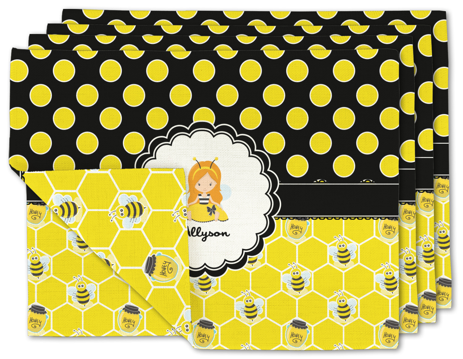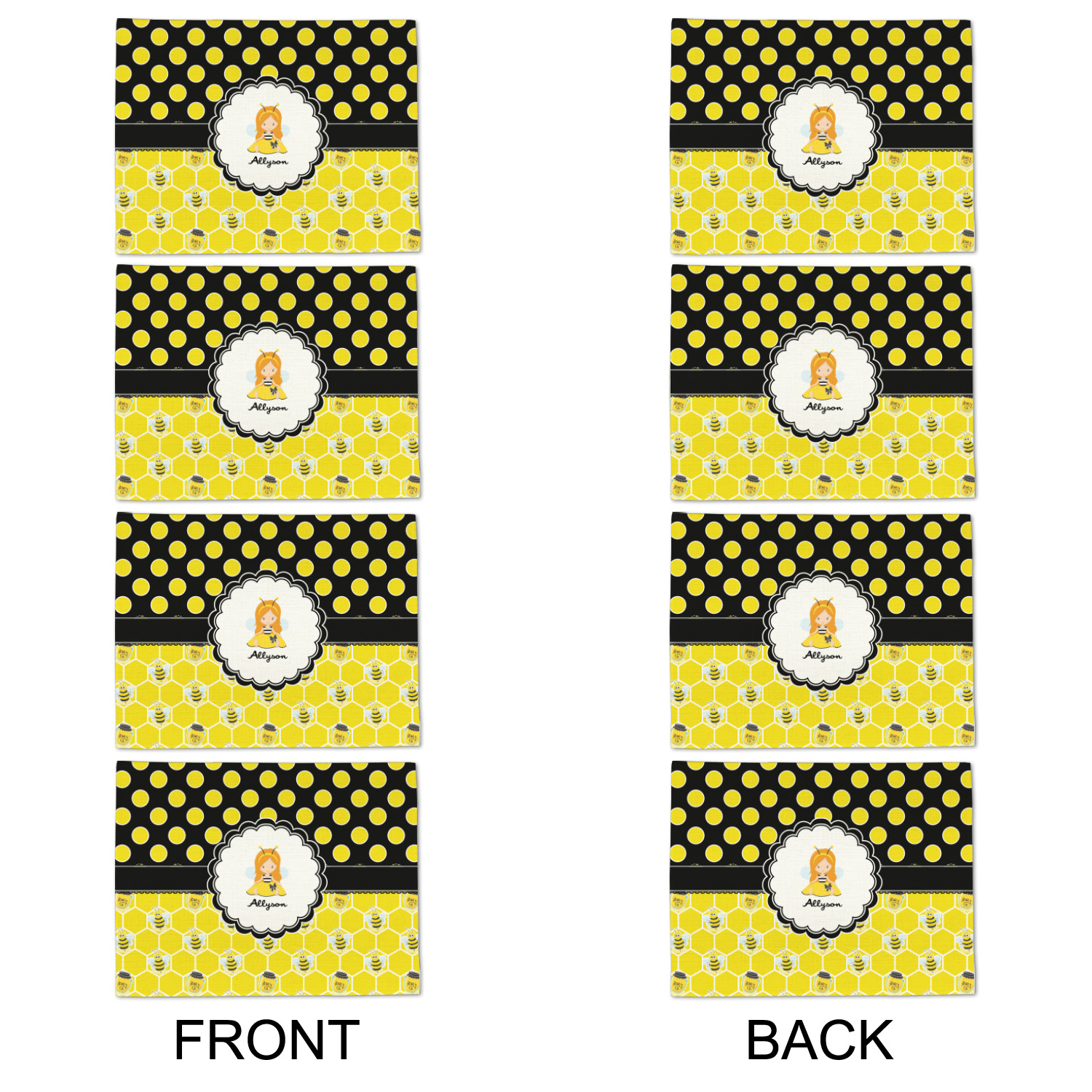 A wide lace black ribbon separates the pattern and connects a beautiful black trimmed white decorative label that provides a focal point for either a little bumble-bee or a bumble-bee obsessed girl and his/her name. As a special touch, personalize your little bumble-bee girl's hair and skin color.