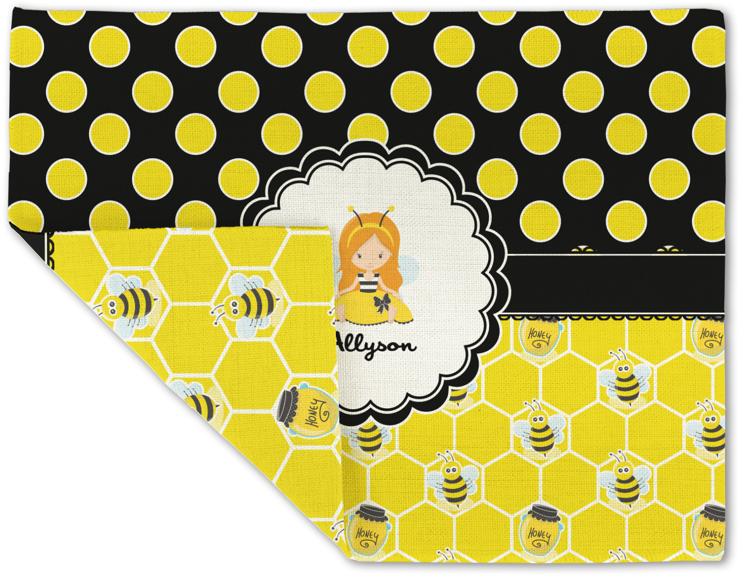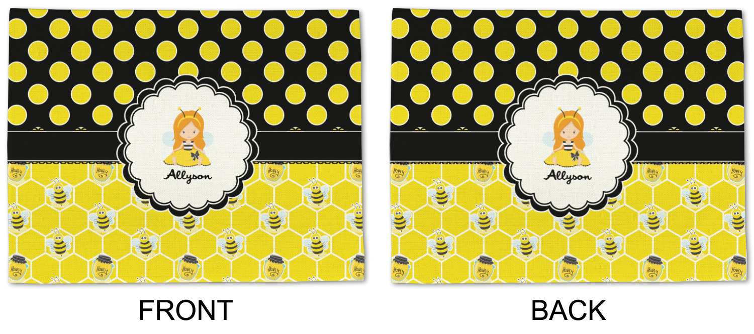 A wide lace black ribbon separates the pattern and connects a beautiful black trimmed white decorative label that provides a focal point for either a little bumble-bee or a bumble-bee obsessed girl and his/her name. As a special touch, personalize your little bumble-bee girl's hair and skin color.