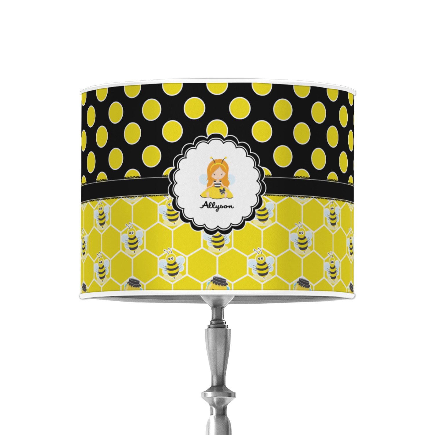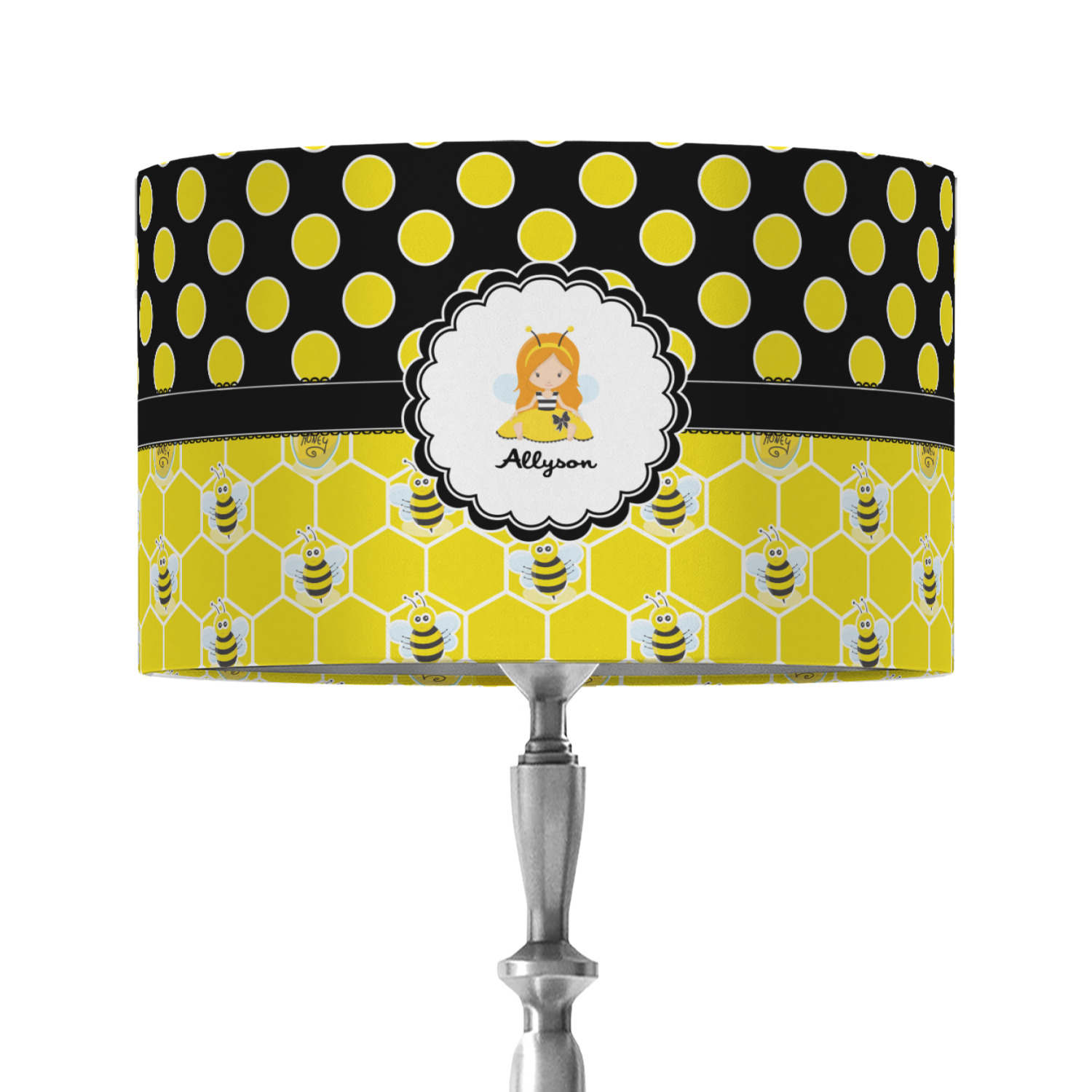 A wide lace black ribbon separates the pattern and connects a beautiful black trimmed white decorative label that provides a focal point for either a little bumble-bee or a bumble-bee obsessed girl and his/her name. As a special touch, personalize your little bumble-bee girl's hair and skin color.