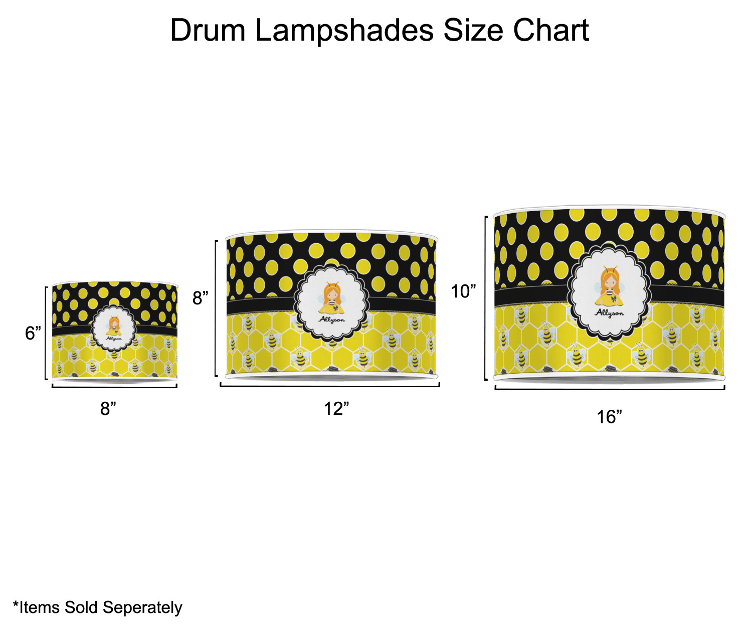 Our customized lamp shades also come in 3 different sizes: 8", 12" and 16", measuring at 8" in diameter by 6" tall, 12" in diameter by 8" tall, and 16" in diameter by 10" tall, respectively.