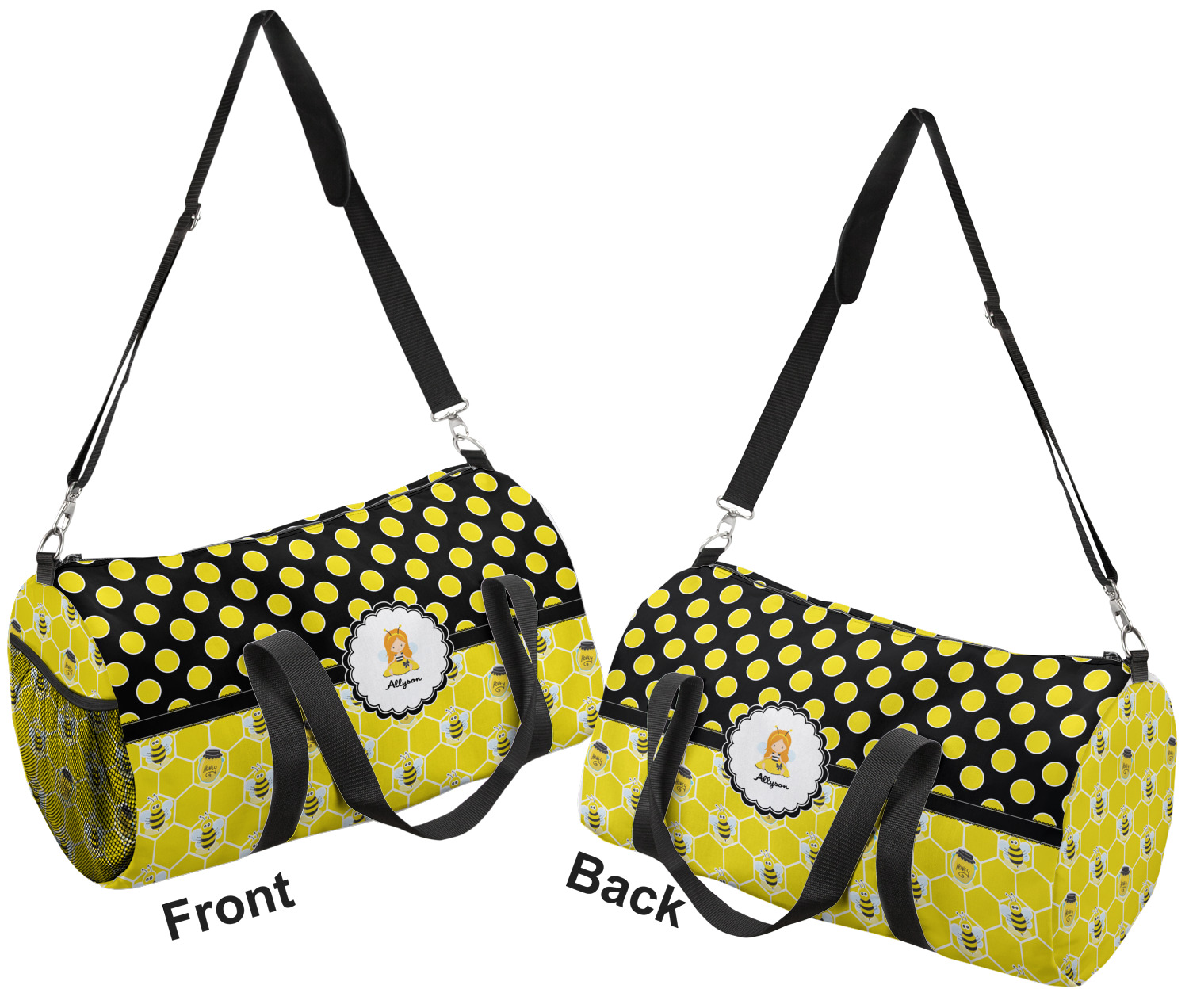 This duffle is a sturdy bag made of a canvas material. It comes in two sizes: Small (19"W x 9.5"H x 9.5"D) and Large (23"W x 12"H x 12"D). The bag is a cylindrical shape with a black adjustable strap and two handles. On one side is an elastic pouch to put a waterbottle or other small item. Your product will be sublimated with your design and is able to be designed on the front, back, and sides. Be sure to remember that the straps may cut into parts of your design if you upload your own artwork.