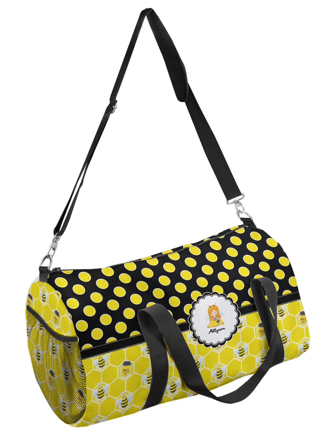 This duffle is a sturdy bag made of a canvas material. It comes in two sizes: Small (19"W x 9.5"H x 9.5"D) and Large (23"W x 12"H x 12"D). The bag is a cylindrical shape with a black adjustable strap and two handles. On one side is an elastic pouch to put a waterbottle or other small item. Your product will be sublimated with your design and is able to be designed on the front, back, and sides. Be sure to remember that the straps may cut into parts of your design if you upload your own artwork.