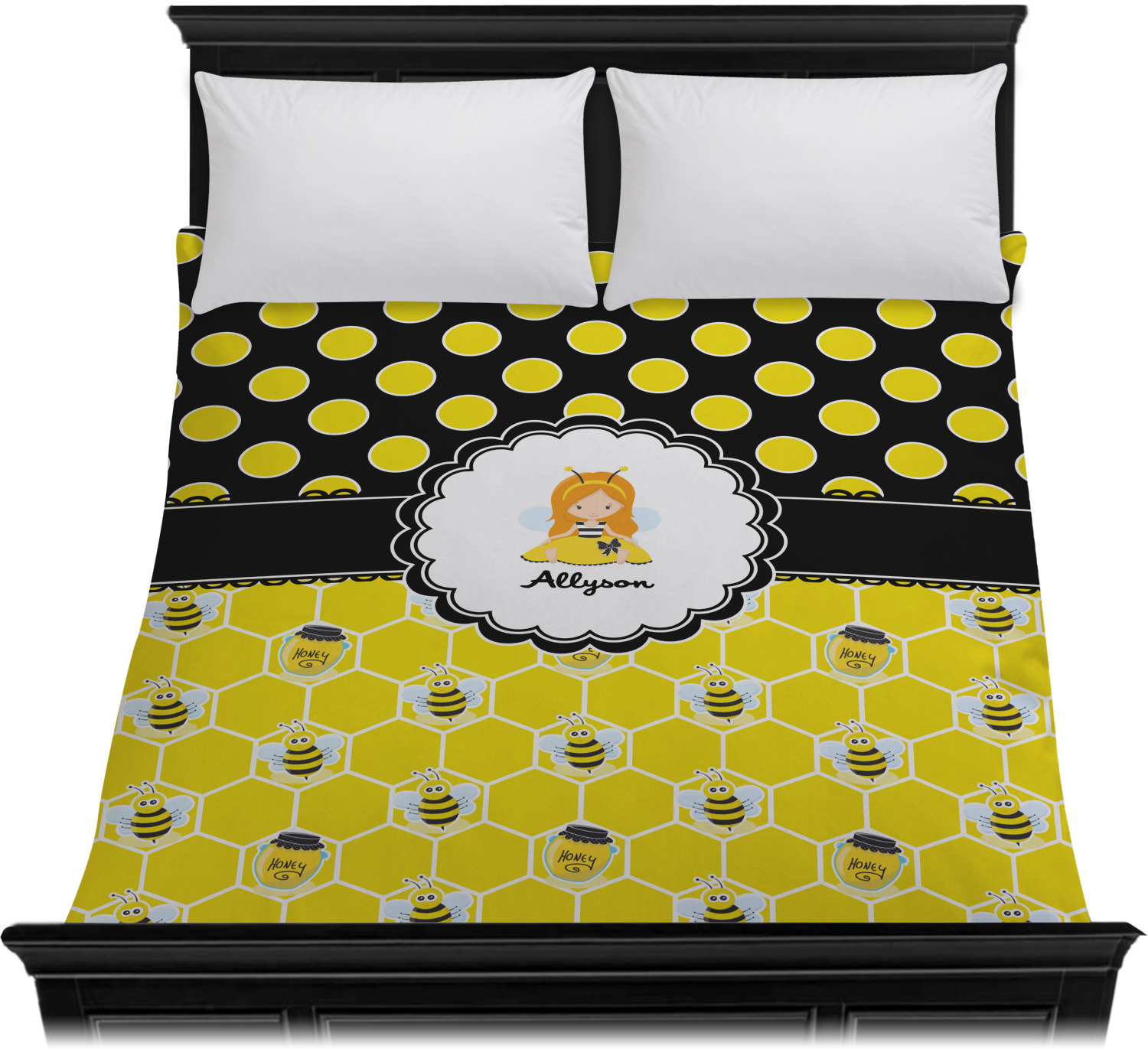 Our little bees have been hard at work and Winnie the Pooh would be jealous of this stash of honey. We used a playful polka dot pattern of black and yellow. On the bottom our bees have been hard at work making honey out of the honeycombs.
