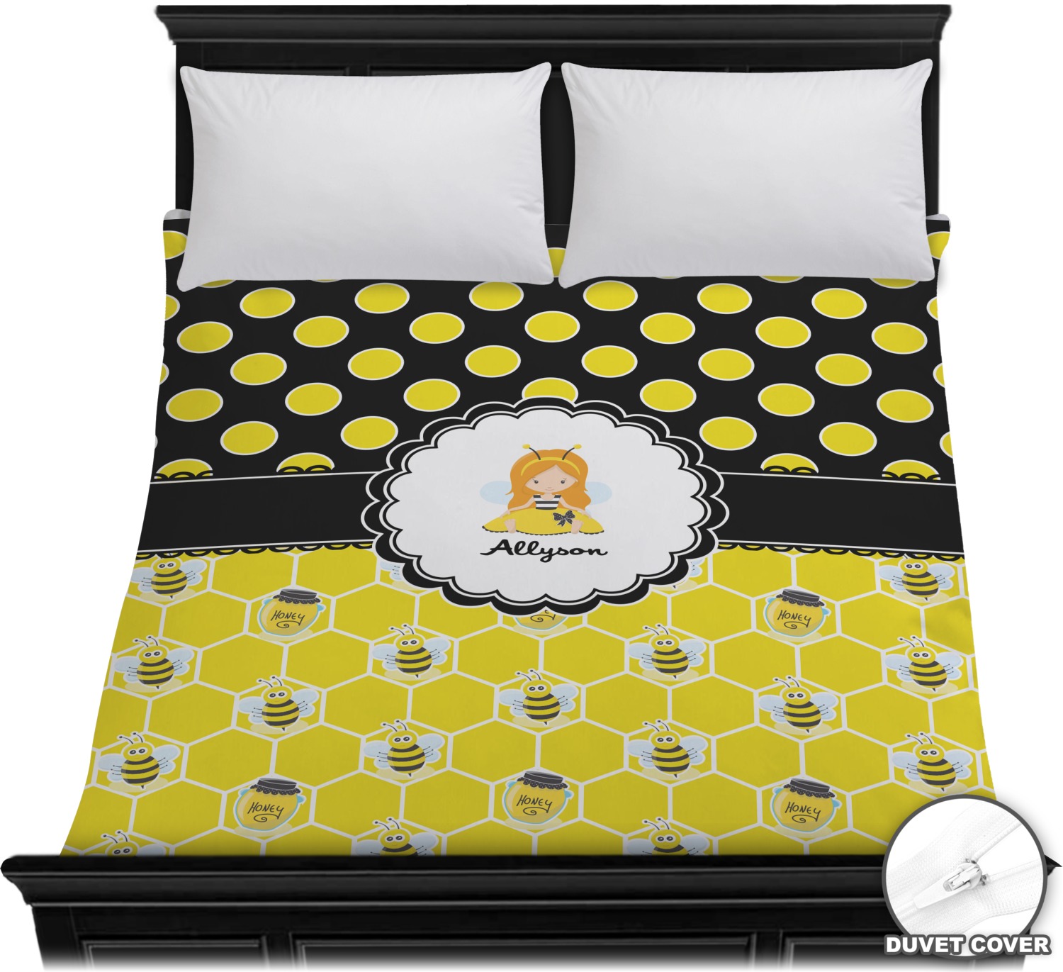 A wide lace black ribbon separates the pattern and connects a beautiful black trimmed white decorative label that provides a focal point for either a little bumble-bee or a bumble-bee obsessed girl and his/her name. As a special touch, personalize your little bumble-bee girl's hair and skin color.