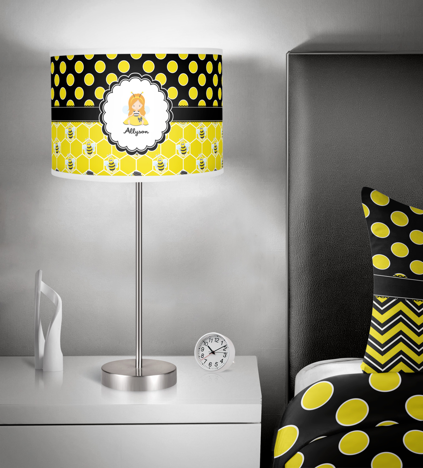 A wide lace black ribbon separates the pattern and connects a beautiful black trimmed white decorative label that provides a focal point for either a little bumble-bee or a bumble-bee obsessed girl and his/her name. As a special touch, personalize your little bumble-bee girl's hair and skin color.