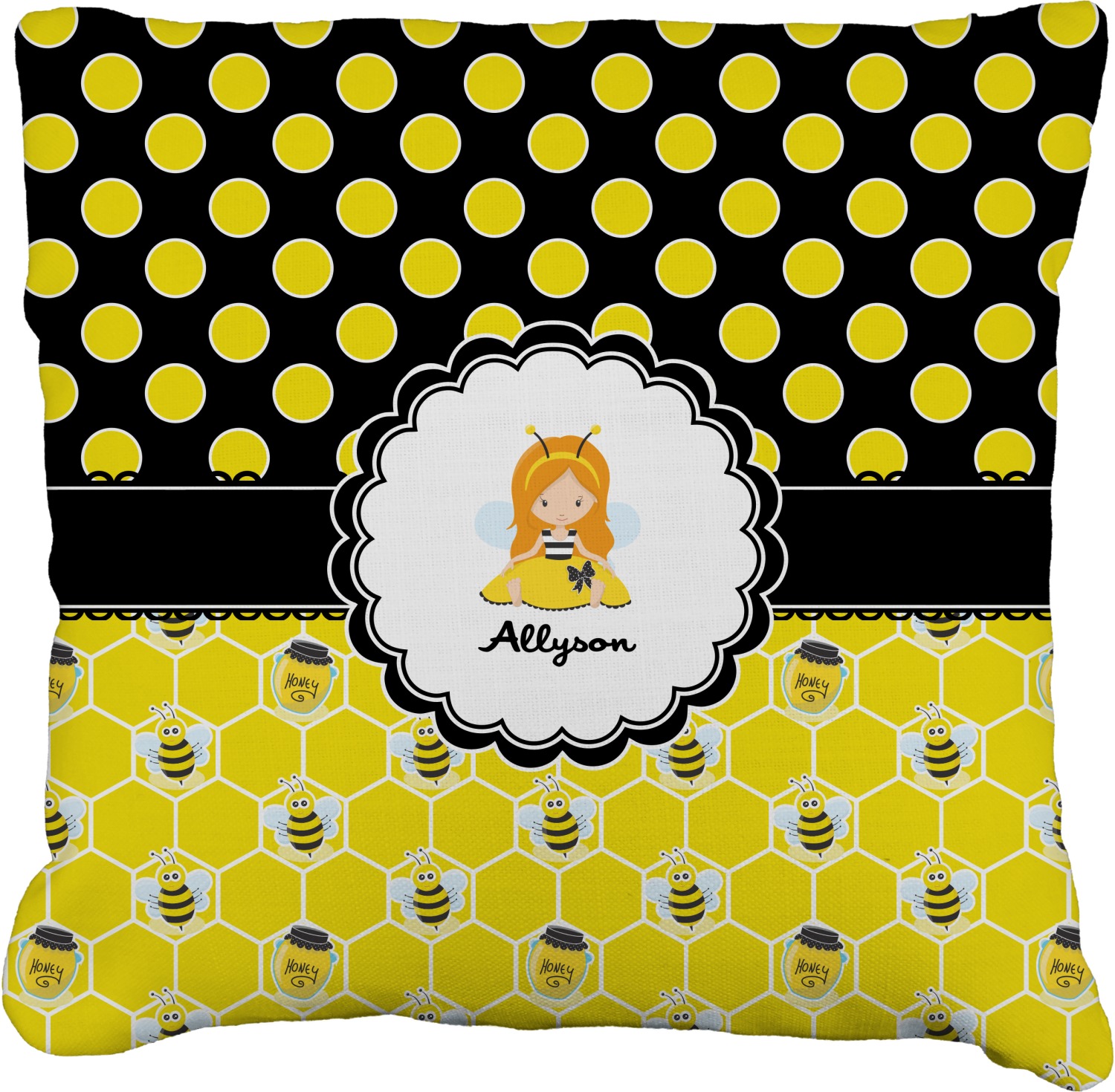 A wide lace black ribbon separates the pattern and connects a beautiful black trimmed white decorative label that provides a focal point for either a little bumble-bee or a bumble-bee obsessed girl and his/her name. As a special touch, personalize your little bumble-bee girl's hair and skin color.