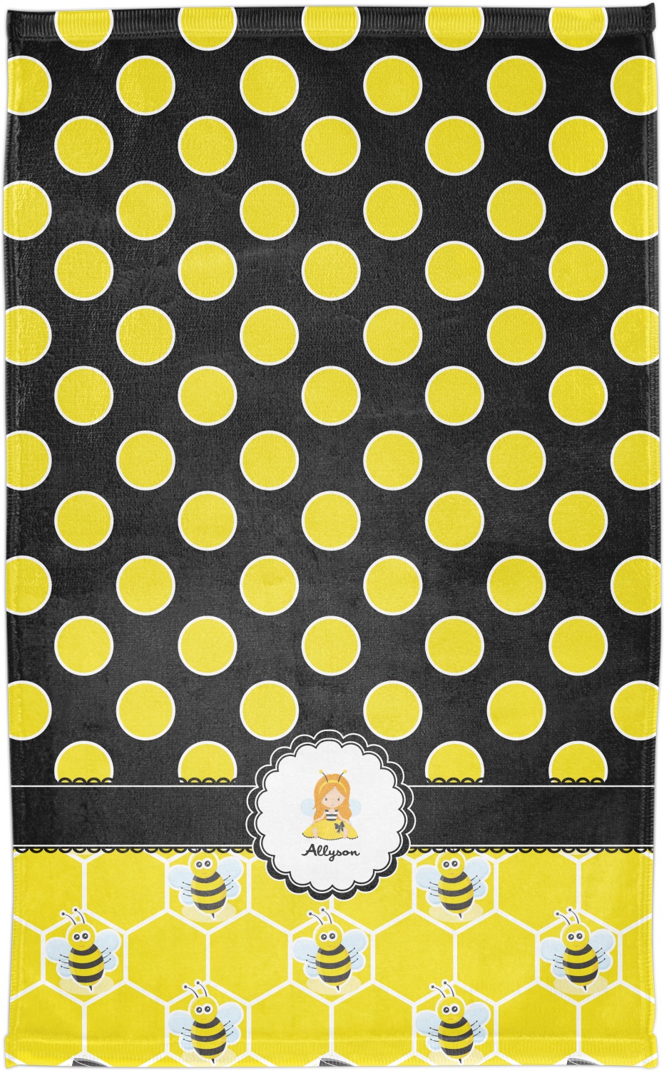 Our little bees have been hard at work and Winnie the Pooh would be jealous of this stash of honey. We used a playful polka dot pattern of black and yellow. On the bottom our bees have been hard at work making honey out of the honeycombs.