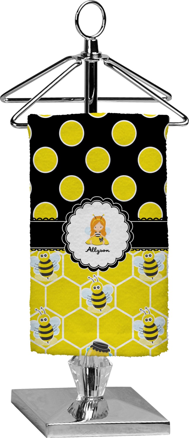 A wide lace black ribbon separates the pattern and connects a beautiful black trimmed white decorative label that provides a focal point for either a little bumble-bee or a bumble-bee obsessed girl and his/her name. As a special touch, personalize your little bumble-bee girl's hair and skin color.