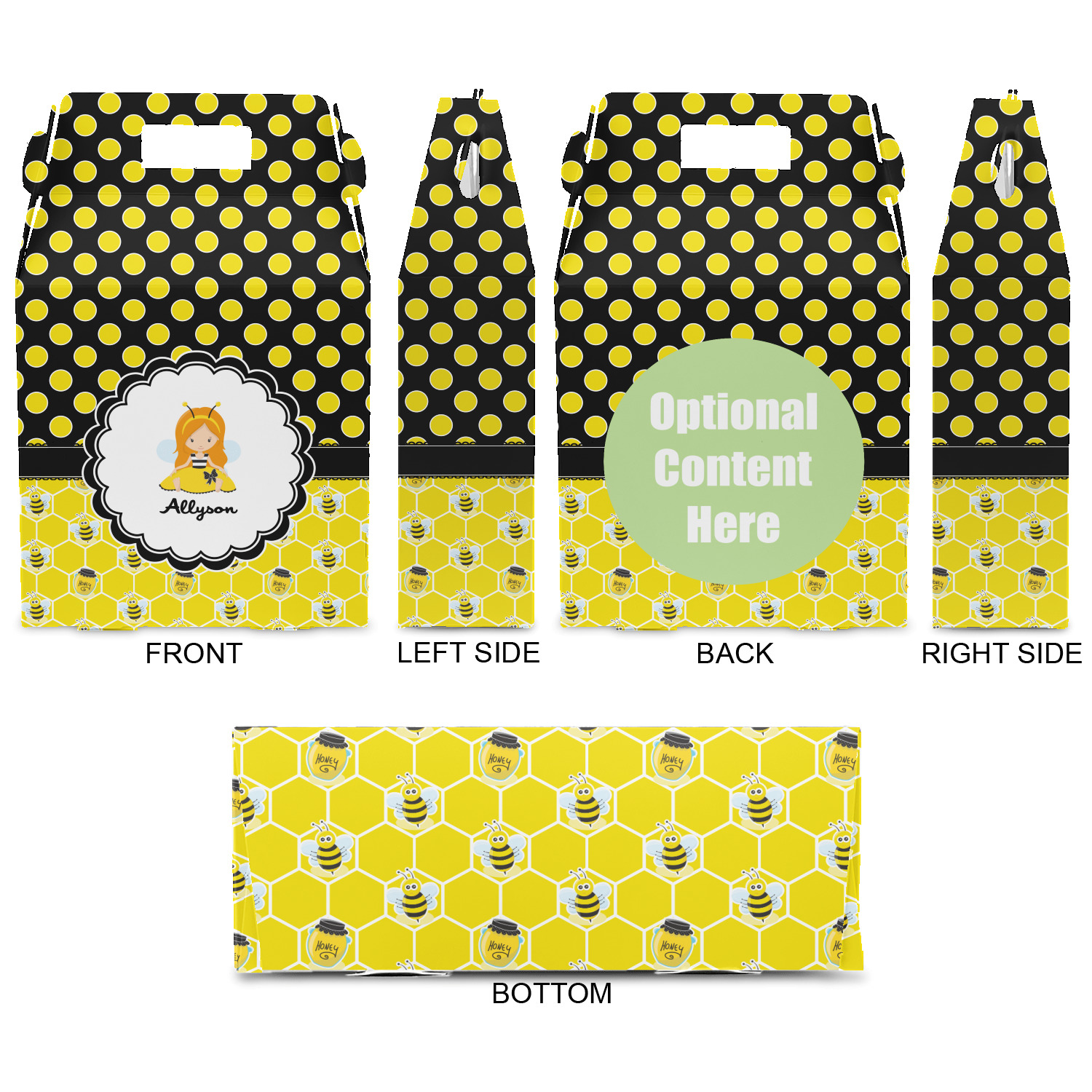 Our little bees have been hard at work and Winnie the Pooh would be jealous of this stash of honey. We used a playful polka dot pattern of black and yellow. On the bottom our bees have been hard at work making honey out of the honeycombs.