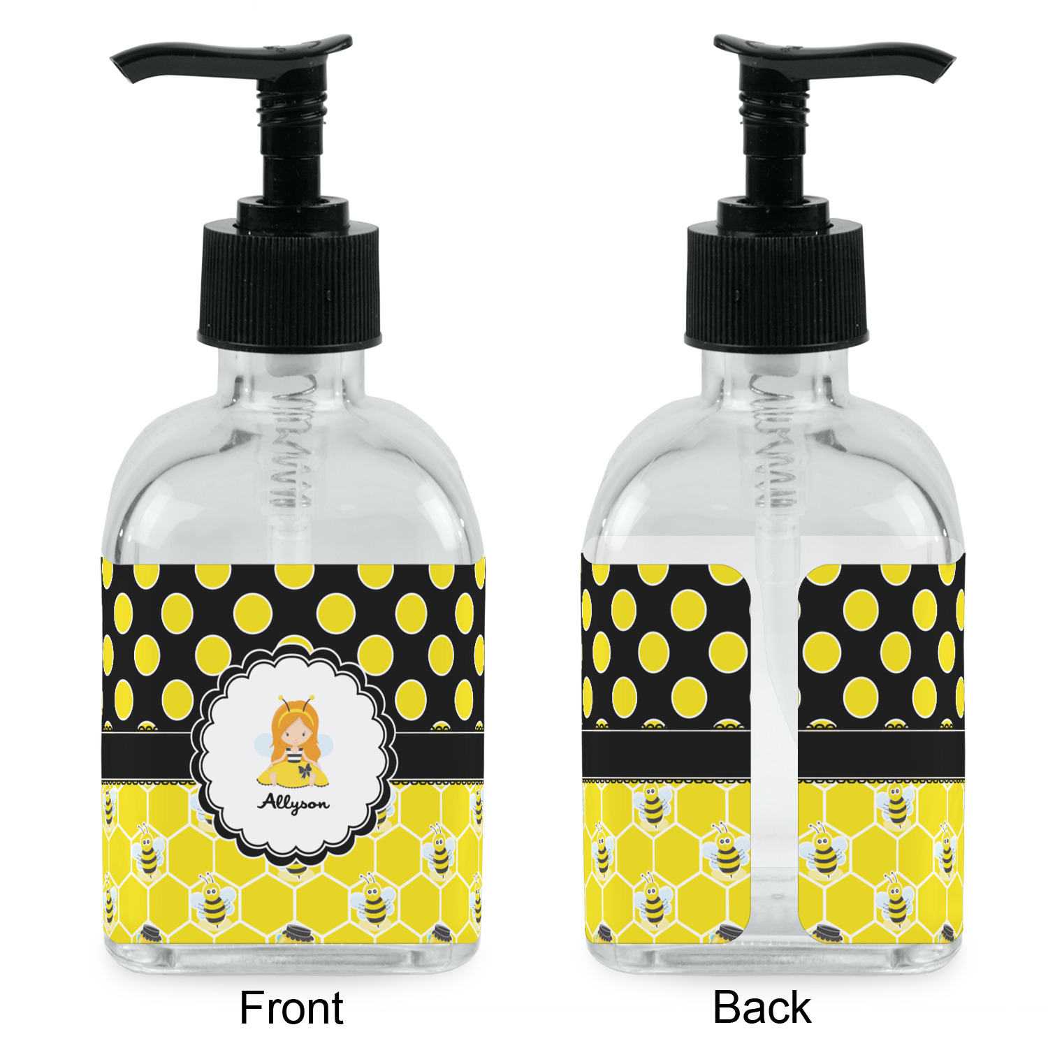 Crafted from a high-quality glass, these soap dispensers and lotion dispensers are durable and robust, while still looking elegant. They are sold with black pumps. Each soap dispenser pump measures at 6.5 by 2.25 inches. On these soap pumps, we display your customized design on a personalized vinyl adhesive on three sides. That way, you can judge how much liquid is in the bottles from the back.
