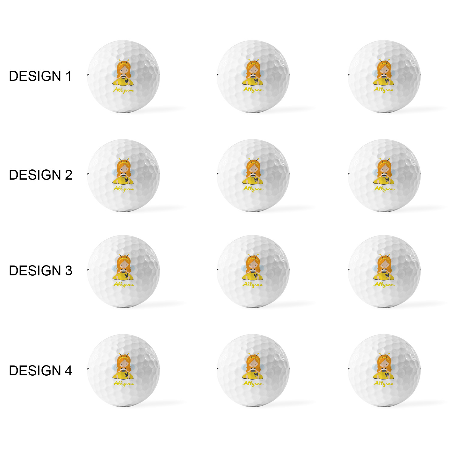 Printed in a 7/8" circle on each ball, you can customize these with our design studio or use your own designs. For a set of 3 you can design each one individually, for a set of 12 you will be able to use 4 unique designs and will receive 3 balls with each design.