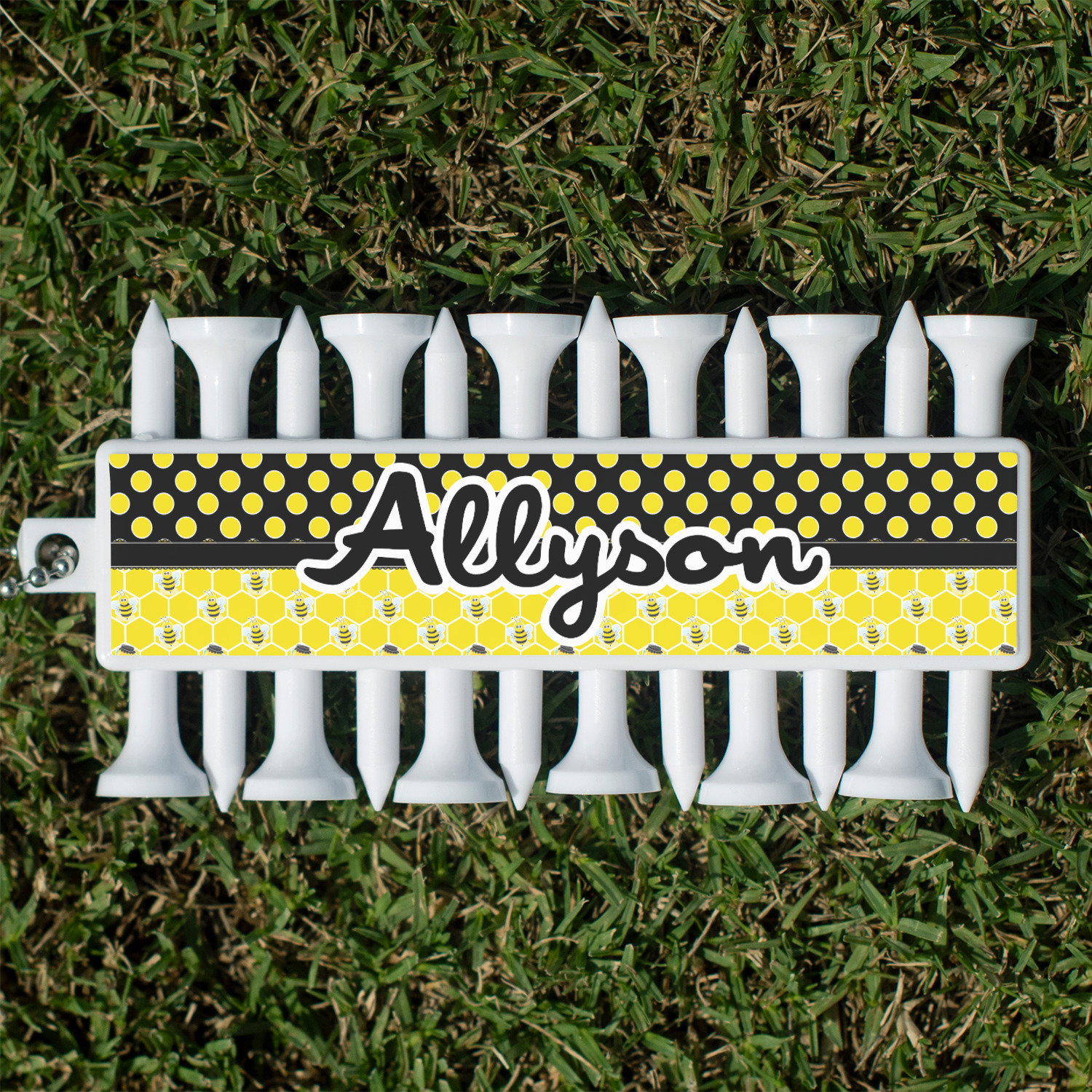 With 12 tees on a lightweight, portable key chain, it almost ensures a great 18 holes. Our tees are made of white plastic and are a little over 2". Design the front and the back of the golf tee holder. Pick from over a hundred designs, colors, and personalization styles! The set even comes with three removable ball markers as well!