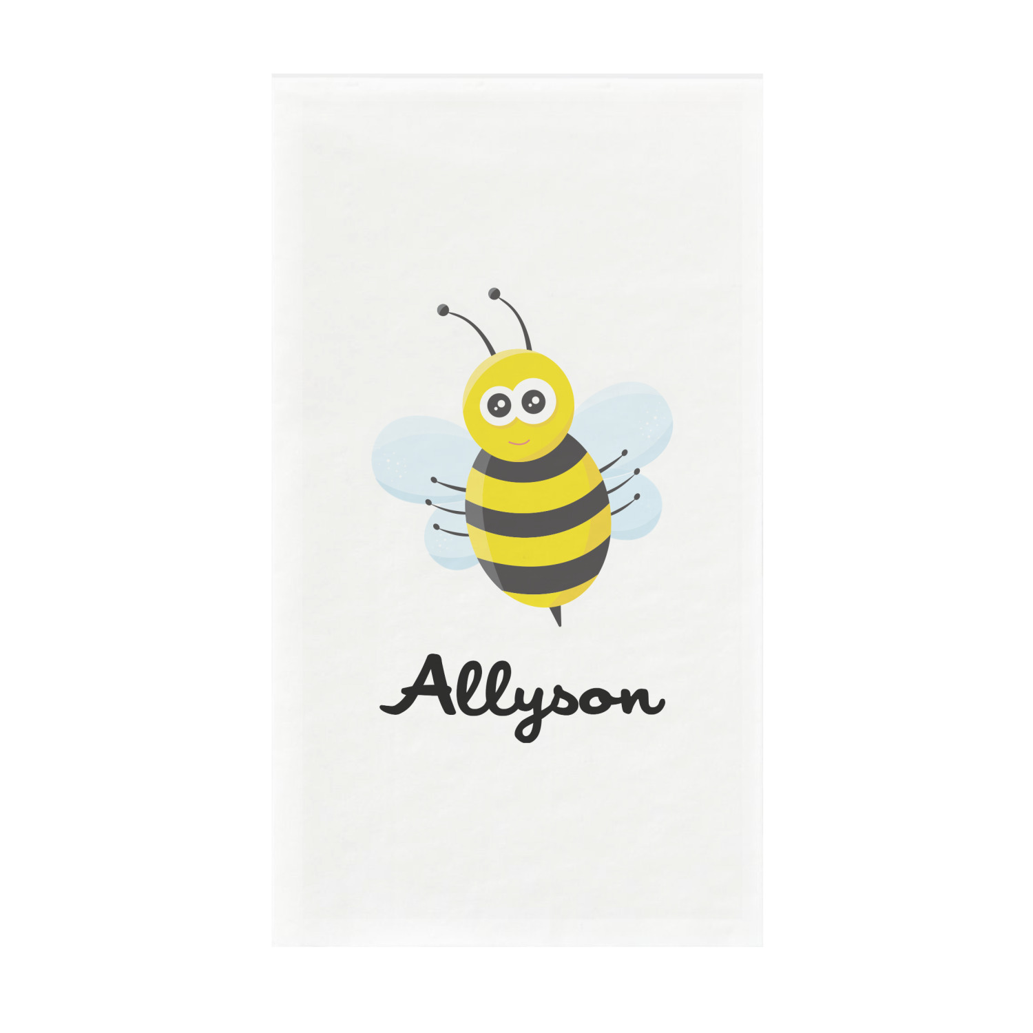 A wide lace black ribbon separates the pattern and connects a beautiful black trimmed white decorative label that provides a focal point for either a little bumble-bee or a bumble-bee obsessed girl and his/her name. As a special touch, personalize your little bumble-bee girl's hair and skin color.