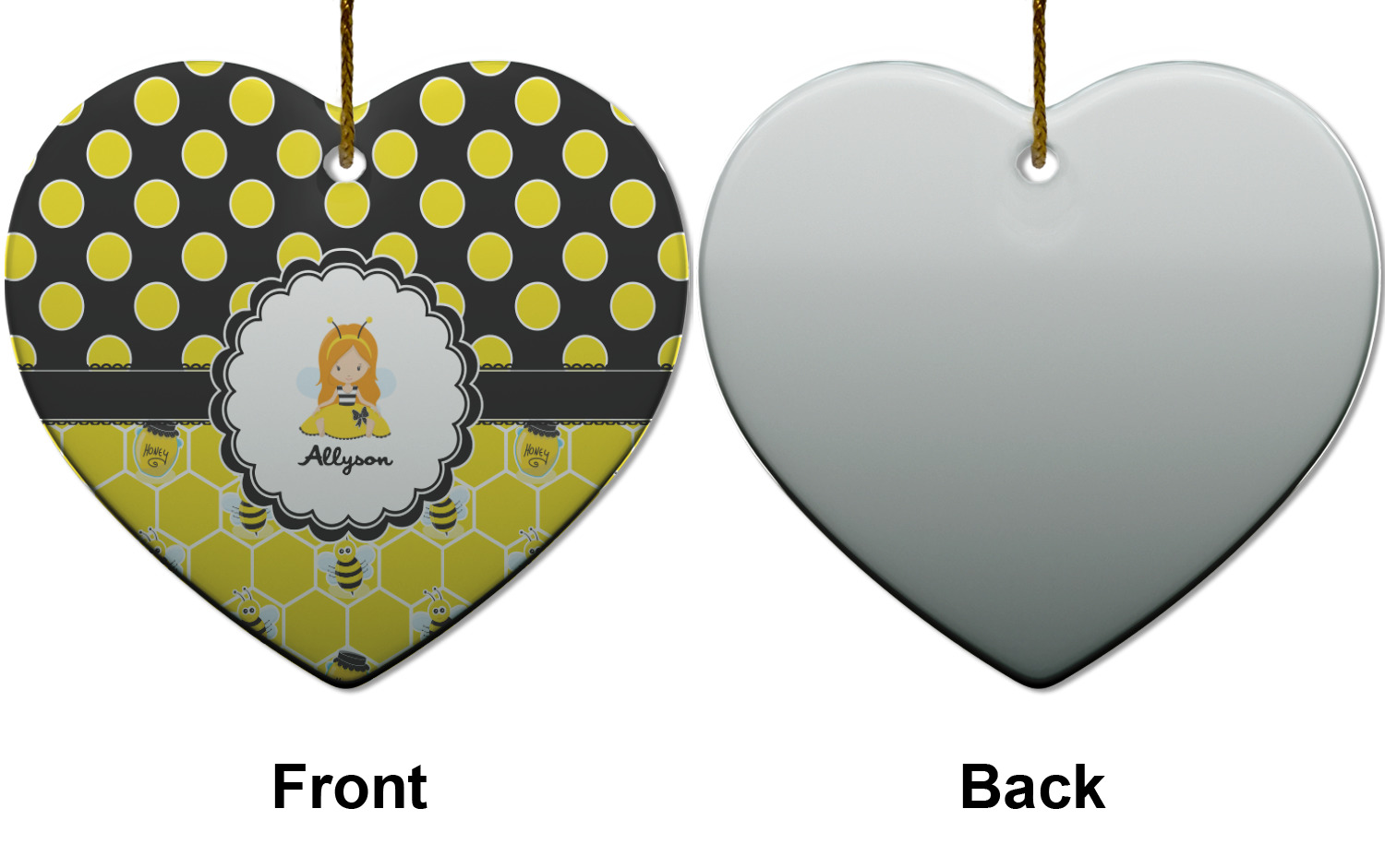 A wide lace black ribbon separates the pattern and connects a beautiful black trimmed white decorative label that provides a focal point for either a little bumble-bee or a bumble-bee obsessed girl and his/her name. As a special touch, personalize your little bumble-bee girl's hair and skin color.