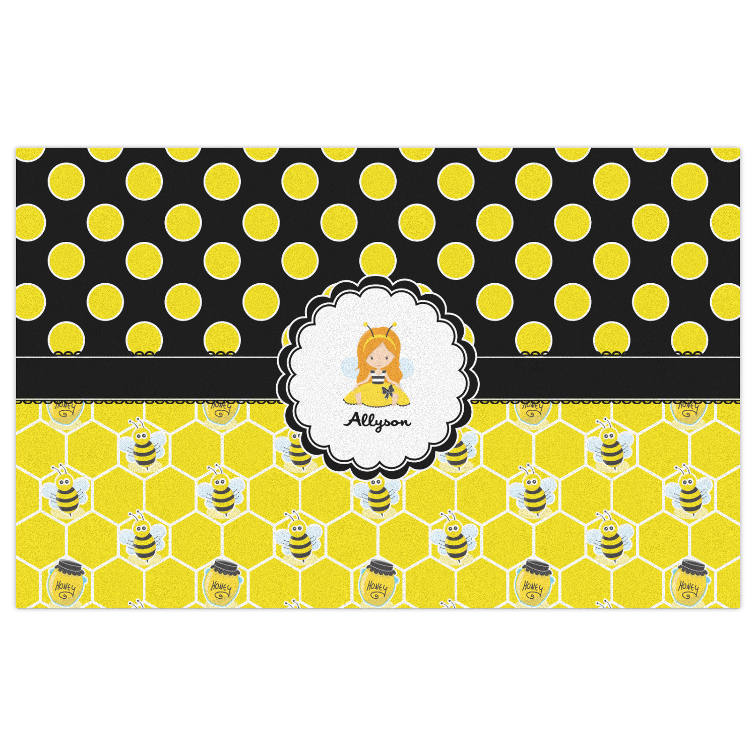 A wide lace black ribbon separates the pattern and connects a beautiful black trimmed white decorative label that provides a focal point for either a little bumble-bee or a bumble-bee obsessed girl and his/her name. As a special touch, personalize your little bumble-bee girl's hair and skin color.