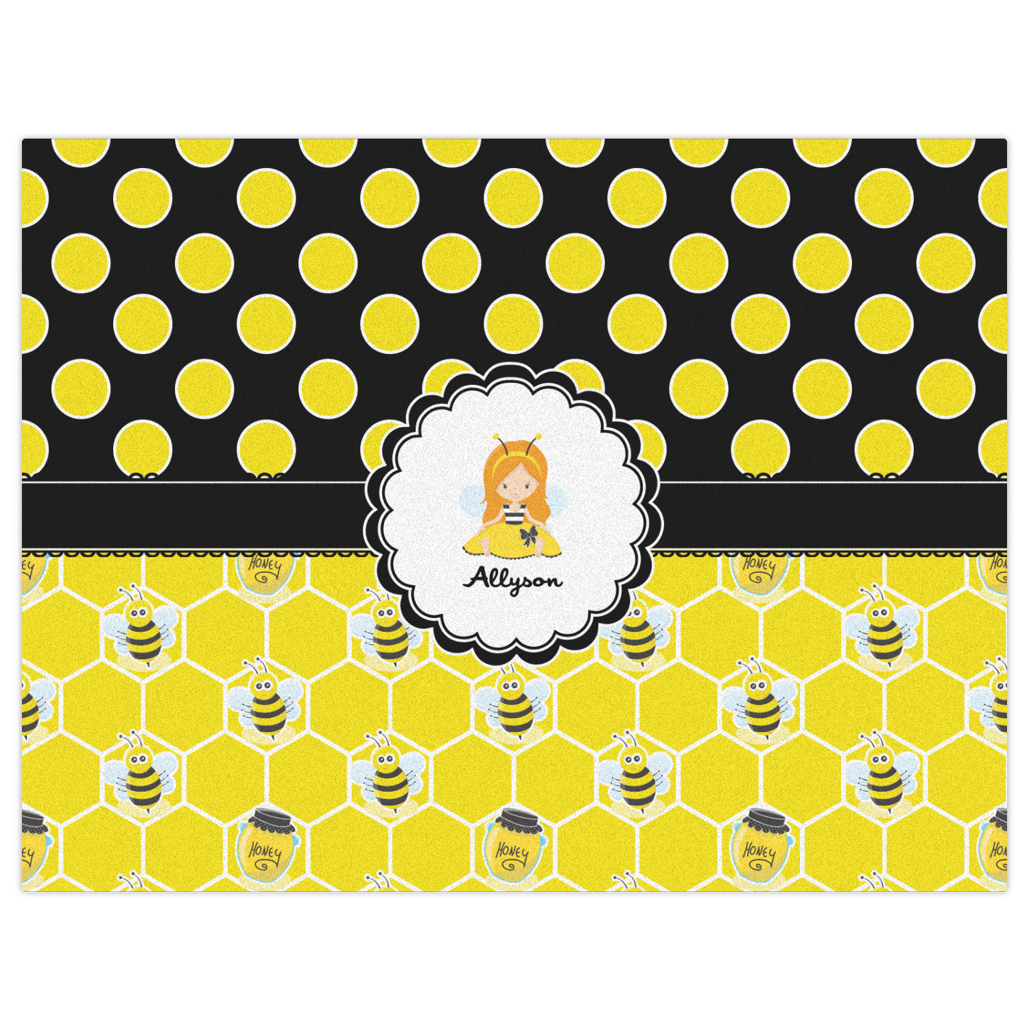 A wide lace black ribbon separates the pattern and connects a beautiful black trimmed white decorative label that provides a focal point for either a little bumble-bee or a bumble-bee obsessed girl and his/her name. As a special touch, personalize your little bumble-bee girl's hair and skin color.