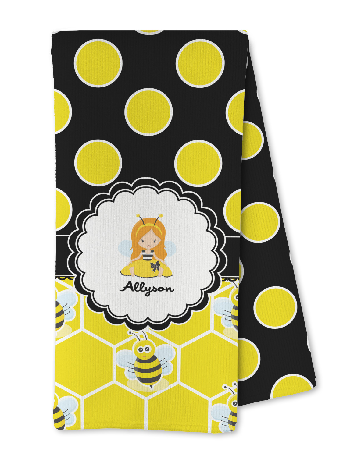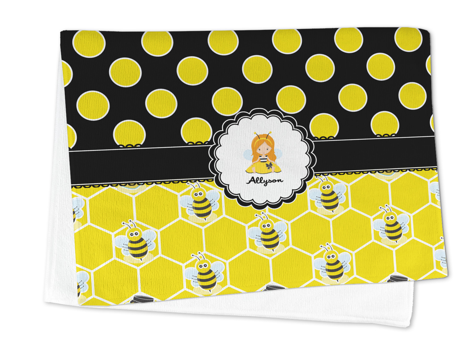 A wide lace black ribbon separates the pattern and connects a beautiful black trimmed white decorative label that provides a focal point for either a little bumble-bee or a bumble-bee obsessed girl and his/her name. As a special touch, personalize your little bumble-bee girl's hair and skin color.