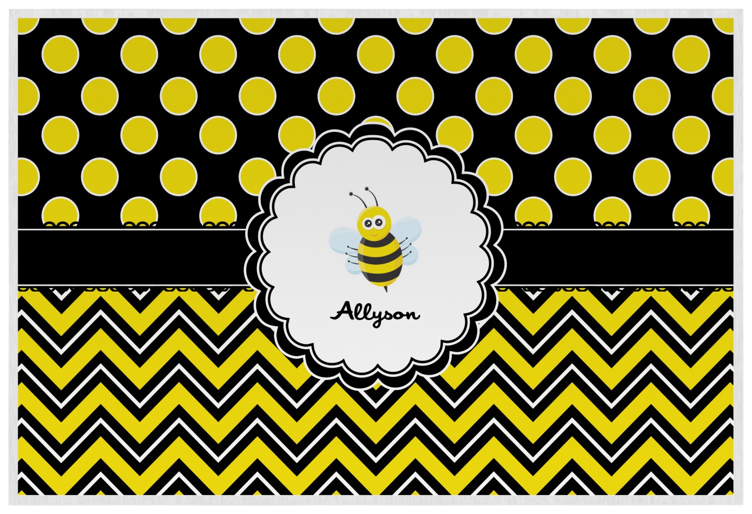 A wide lace black ribbon separates the pattern and connects a beautiful black trimmed white decorative label that provides a focal point for either a little bumble-bee or a bumble-bee obsessed girl and his/her name. As a special touch, personalize your little bumble-bee girl's hair and skin color.