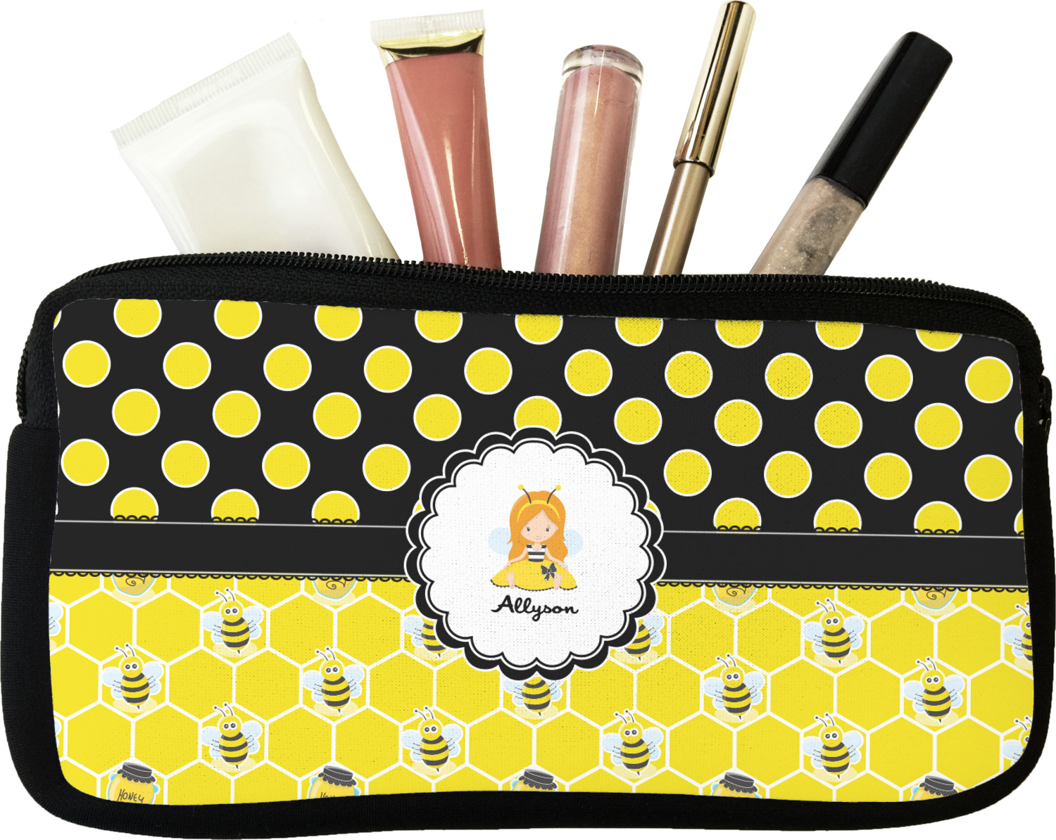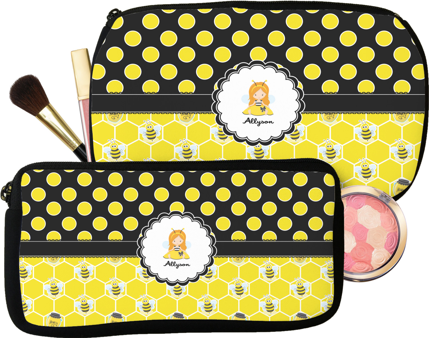 Our personalized makeup bags are available in many different designs, patterns and colors - so you are sure to find one that will love. They are made of neoprene (same material as wet-suits) and thus are water resistant, so spillages in your makeup bag will not end up all over you purse. They are customized on one side and are black on the other side and the zipper is black as well.