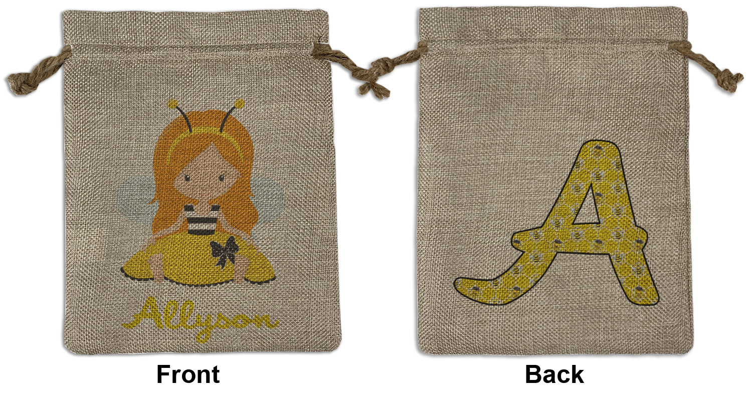 We sell our Burlap Gift Bags in 3 variant sized bags. Made with burlap polyester, each personalized bag can be secured with a twine drawstring pull. Your custom design is available to print on one side or both sides - completely up to you! The sizes of the bags measure approximately 4.5" x 6.5" for the smallest size, 6.5" x 8.0" for the medium size, and 6.5" x 13.5" for the large-sized bag.