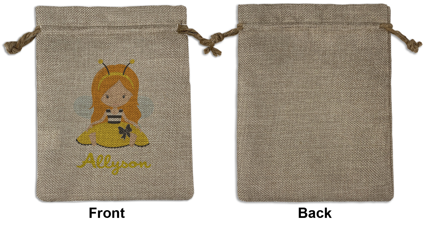 We sell our Burlap Gift Bags in 3 variant sized bags. Made with burlap polyester, each personalized bag can be secured with a twine drawstring pull. Your custom design is available to print on one side or both sides - completely up to you! The sizes of the bags measure approximately 4.5" x 6.5" for the smallest size, 6.5" x 8.0" for the medium size, and 6.5" x 13.5" for the large-sized bag.