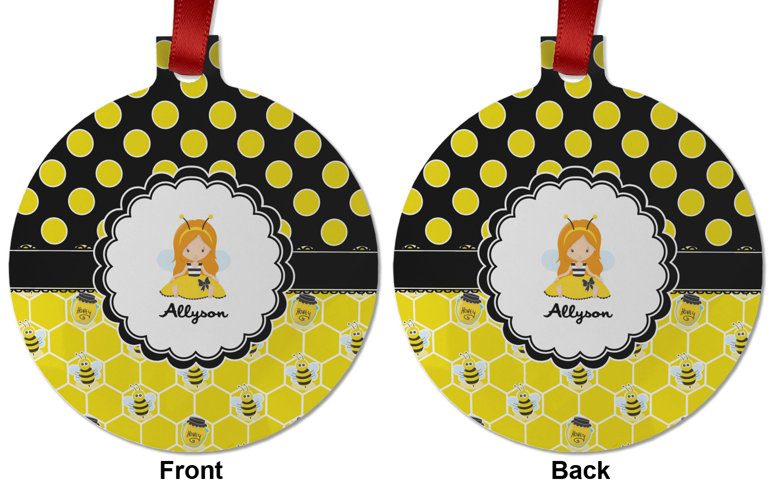 A wide lace black ribbon separates the pattern and connects a beautiful black trimmed white decorative label that provides a focal point for either a little bumble-bee or a bumble-bee obsessed girl and his/her name. As a special touch, personalize your little bumble-bee girl's hair and skin color.
