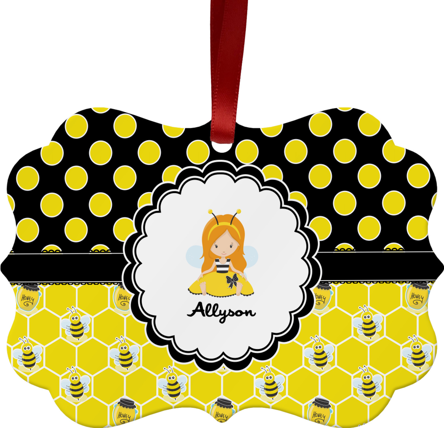 A wide lace black ribbon separates the pattern and connects a beautiful black trimmed white decorative label that provides a focal point for either a little bumble-bee or a bumble-bee obsessed girl and his/her name. As a special touch, personalize your little bumble-bee girl's hair and skin color.