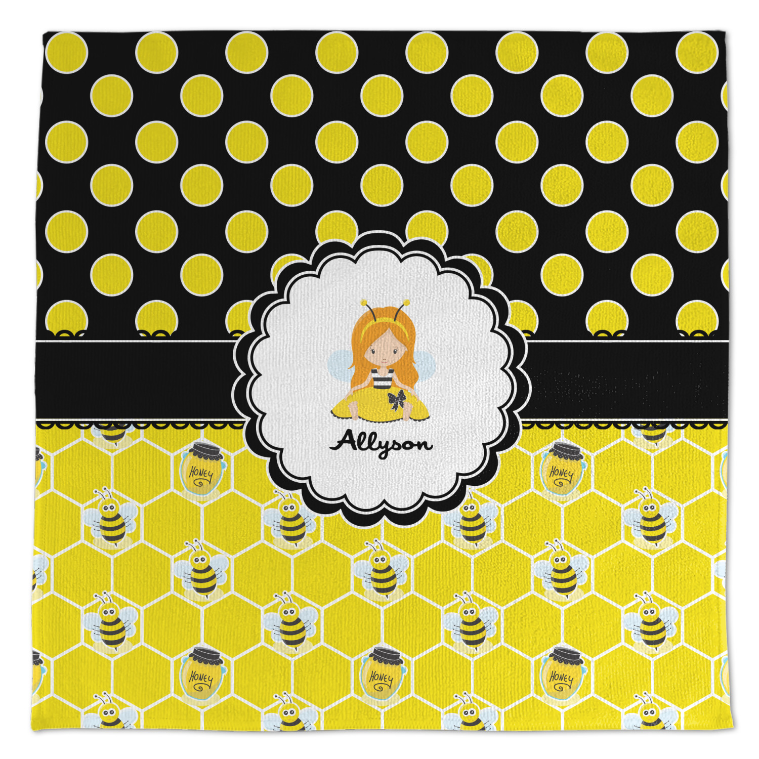 A wide lace black ribbon separates the pattern and connects a beautiful black trimmed white decorative label that provides a focal point for either a little bumble-bee or a bumble-bee obsessed girl and his/her name. As a special touch, personalize your little bumble-bee girl's hair and skin color.