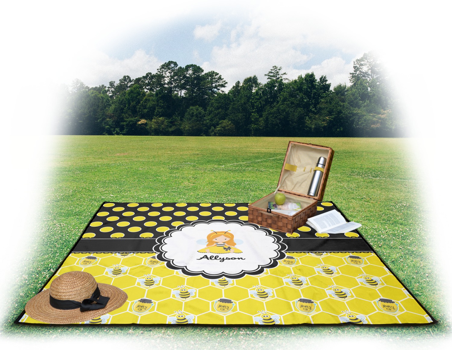 This picnic blanket is perfect for hanging out with your friends at the park or anywhere outside. The top of the blanket is made of a super soft microfiber fleece. The bottom of the blanket is made of a black material similar to a rain jacket and is water repellent as well. This will keep any wet spots on the ground from soaking through your picnic blanket. No one likes a wet blanket. The blanket measures at approximately 50" x 59" and has a nicely finished ribbon edge.
