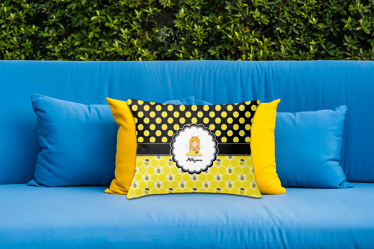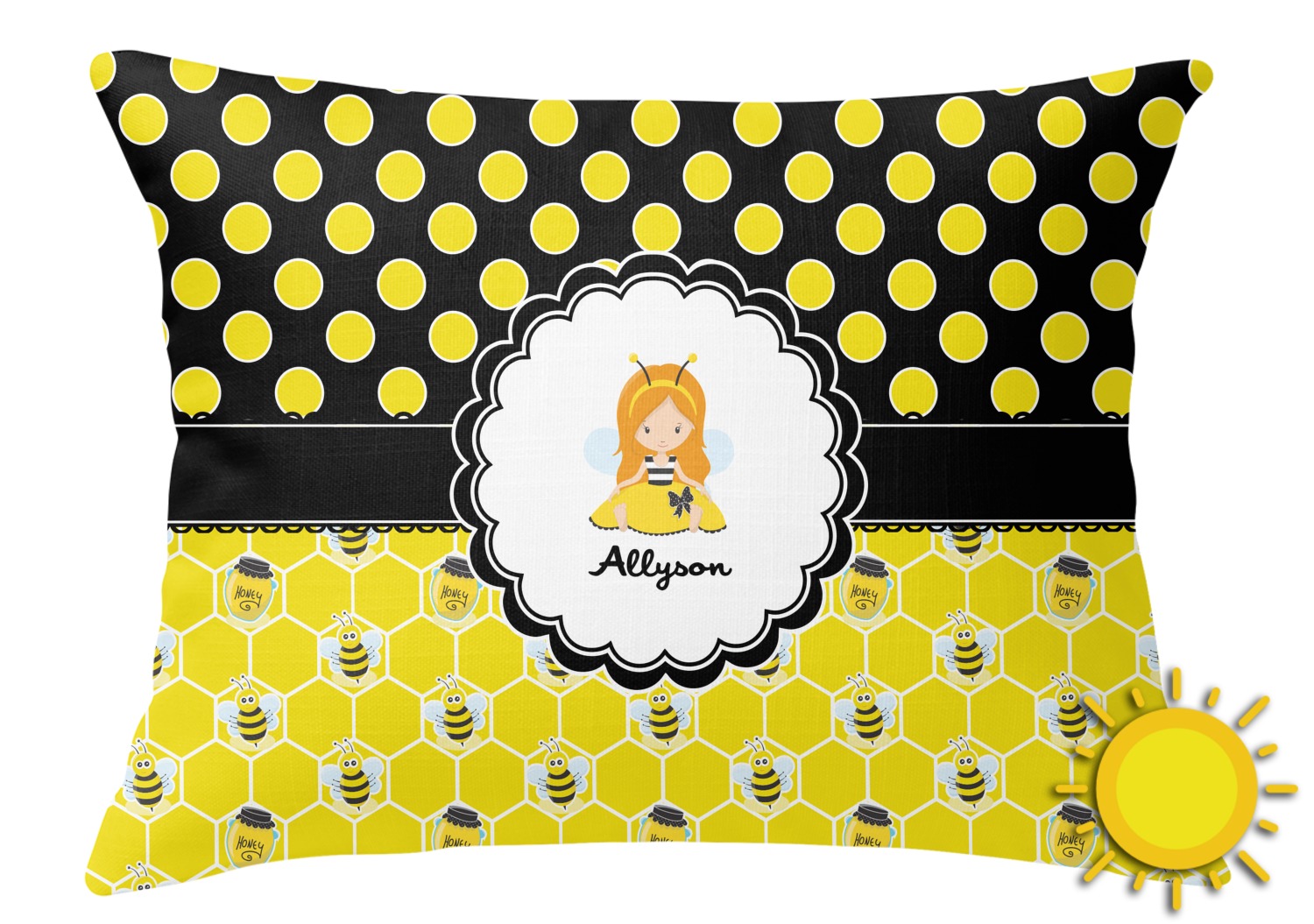 A wide lace black ribbon separates the pattern and connects a beautiful black trimmed white decorative label that provides a focal point for either a little bumble-bee or a bumble-bee obsessed girl and his/her name. As a special touch, personalize your little bumble-bee girl's hair and skin color.