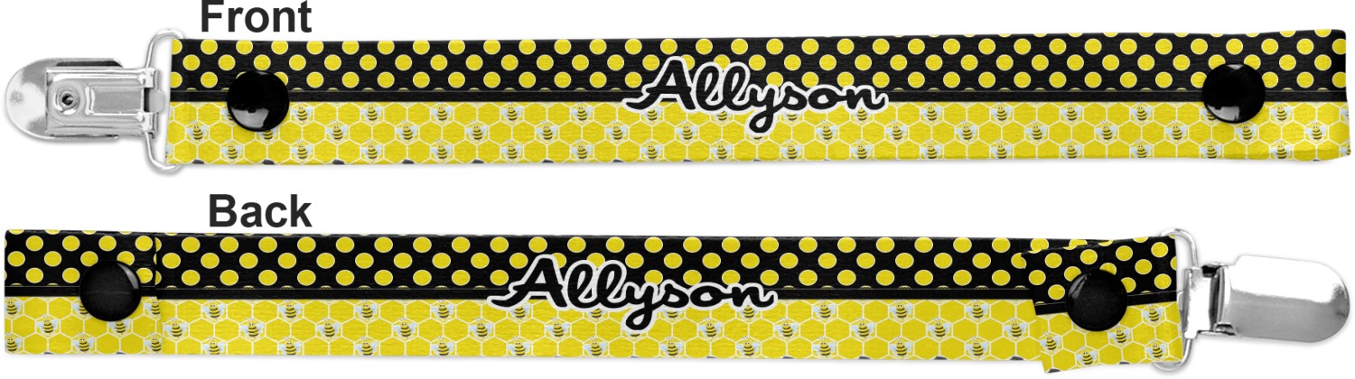 This personalized pacifier clip is the ideal size and measures at approximately 7.5 inches in length, when either end is snapped closed. On one end, you'll find a snap button. This button of your baby's pacifier holder is what can be attached to their pacifier to hold is securely in place. Simply open the snap, slip it through the pacifier opening, and snap it back into place. On the opposite end of this baby pacifier holder, you'll find a metal clip that can secure to a baby's collar or sleeve. This clip ensures that the strap stays in place, and that your baby's pacifier is always on hand.