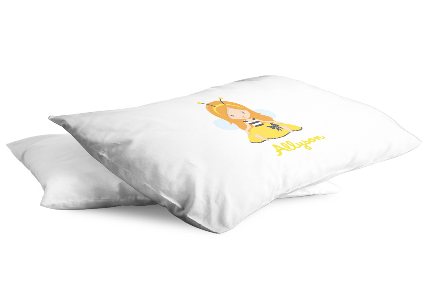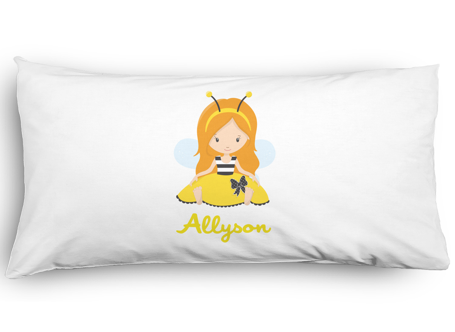 A wide lace black ribbon separates the pattern and connects a beautiful black trimmed white decorative label that provides a focal point for either a little bumble-bee or a bumble-bee obsessed girl and his/her name. As a special touch, personalize your little bumble-bee girl's hair and skin color.