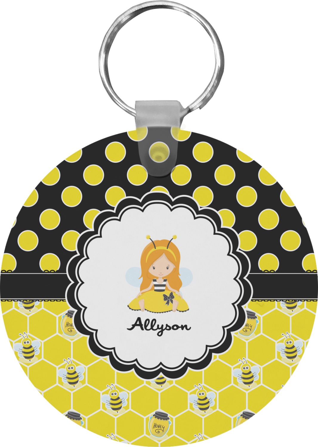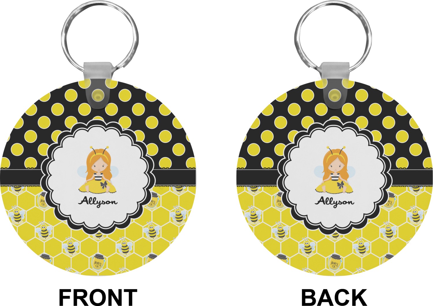 Our personalized keychains attach to the included metal, split key ring with a plastic, removable snap. Since a metal ring is included with your purchase, you have the liberty to keep your keys together on the ring, with or without your unique keychain. We offer this keychain in three different shapes: circle, heart, or diamond. We print your personalized design(s) on both sides of the key chain, and the surface has a glossy, reflective finish that only emphasizes your design. Each keychain is approximately 2.25 by 2.25 inches.