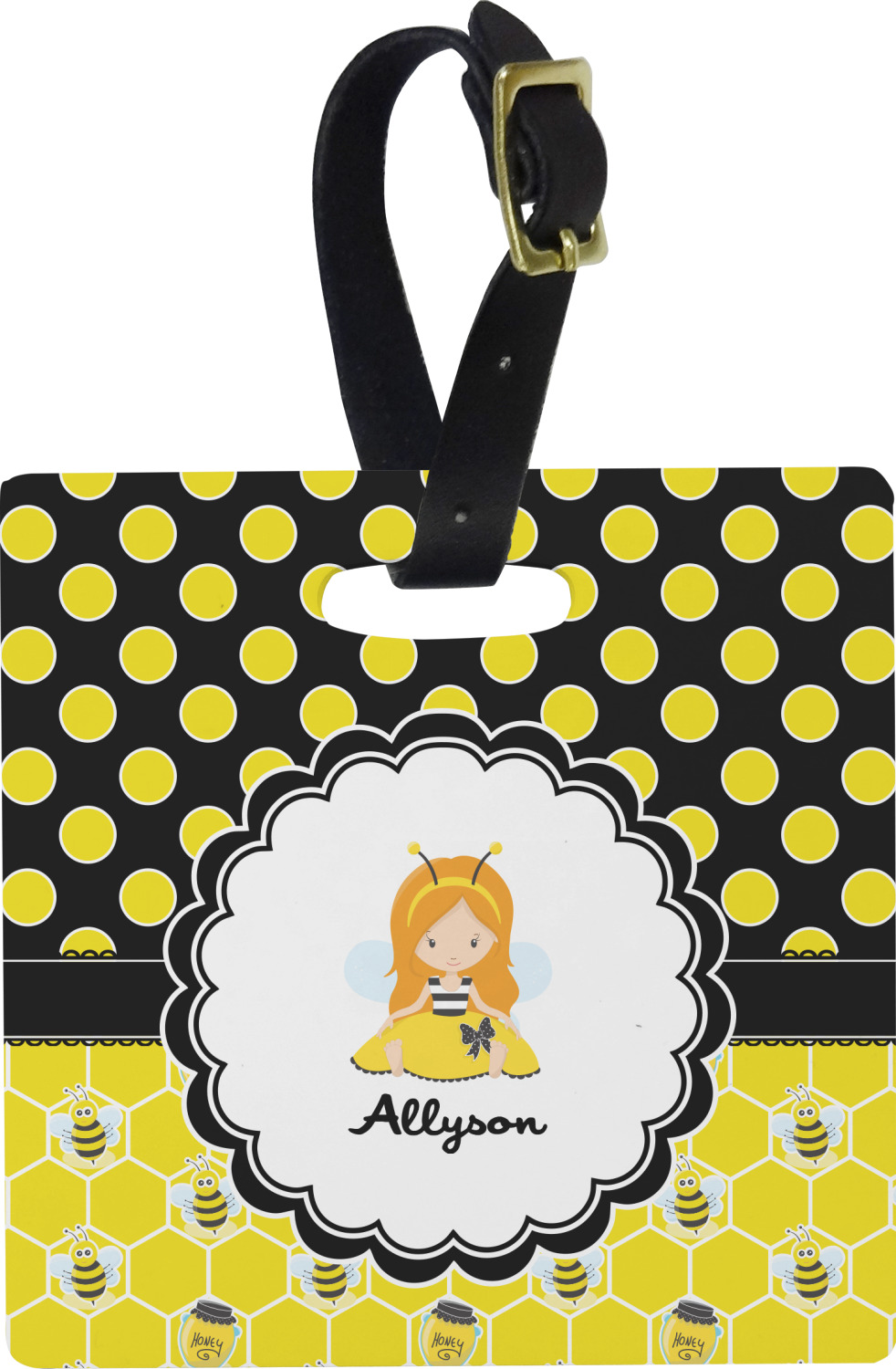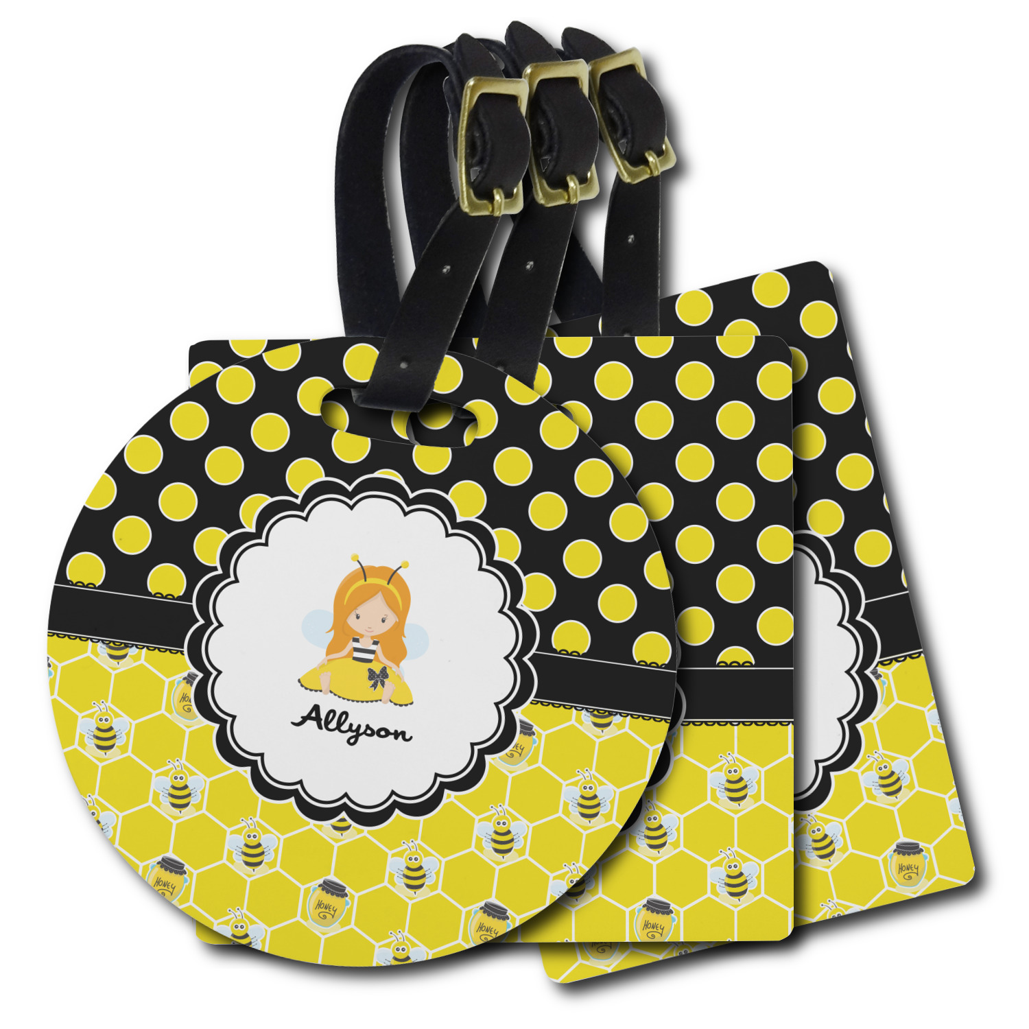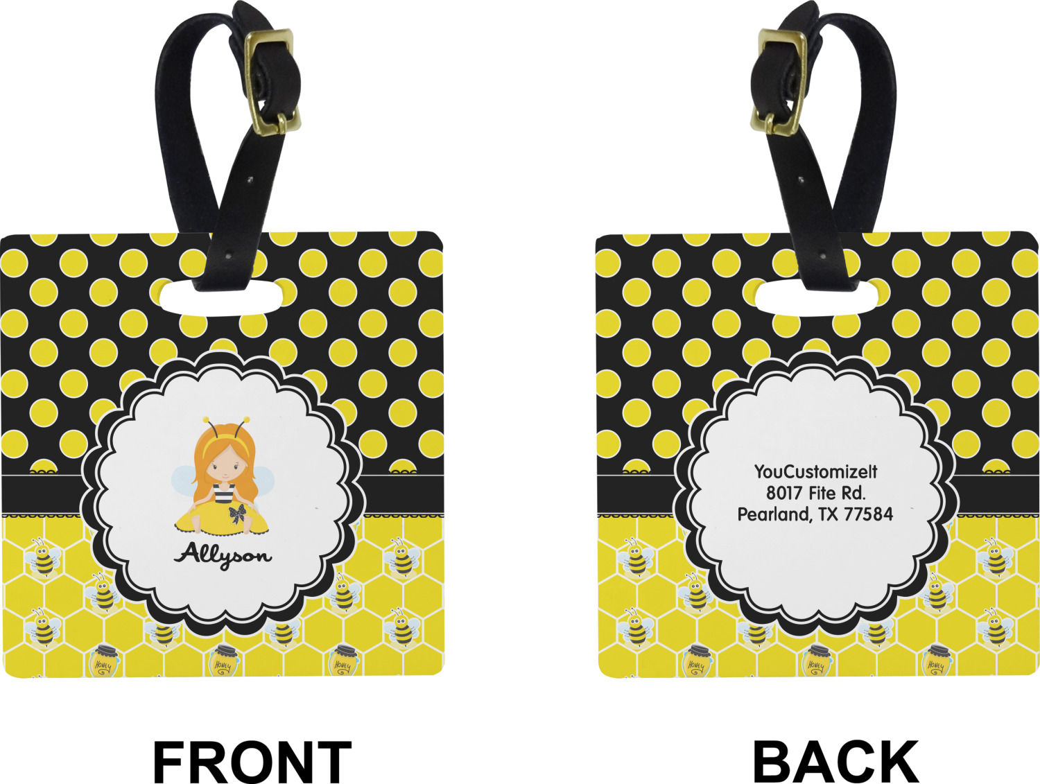 These personalized bag tags are sold in a variety of shapes, so that you may find the product that meets your vision exactly. We sell a round luggage tag, which measures at approximately 4" x 4". Our square luggage tag is about 3.5" x 3.5", while our rectangular version is 2.75" x 4 ".