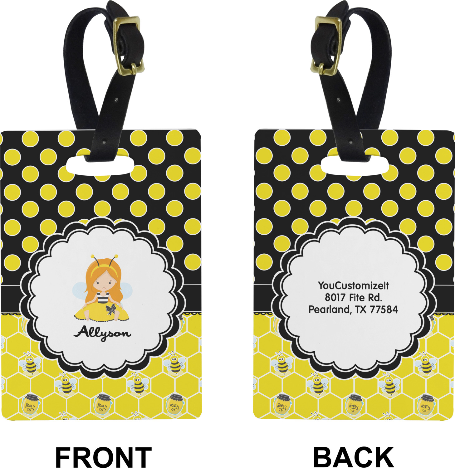These personalized bag tags are sold in a variety of shapes, so that you may find the product that meets your vision exactly. We sell a round luggage tag, which measures at approximately 4" x 4". Our square luggage tag is about 3.5" x 3.5", while our rectangular version is 2.75" x 4 ".
