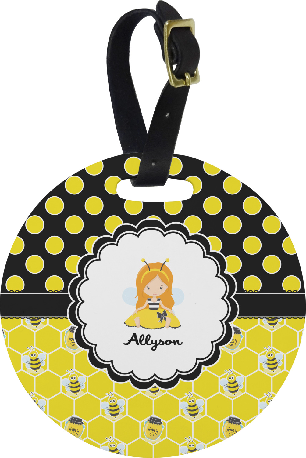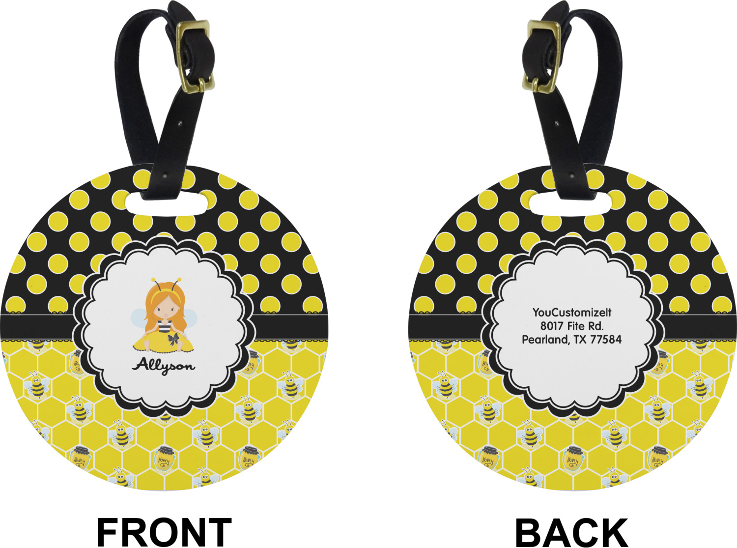 These personalized bag tags are sold in a variety of shapes, so that you may find the product that meets your vision exactly. We sell a round luggage tag, which measures at approximately 4" x 4". Our square luggage tag is about 3.5" x 3.5", while our rectangular version is 2.75" x 4 ".