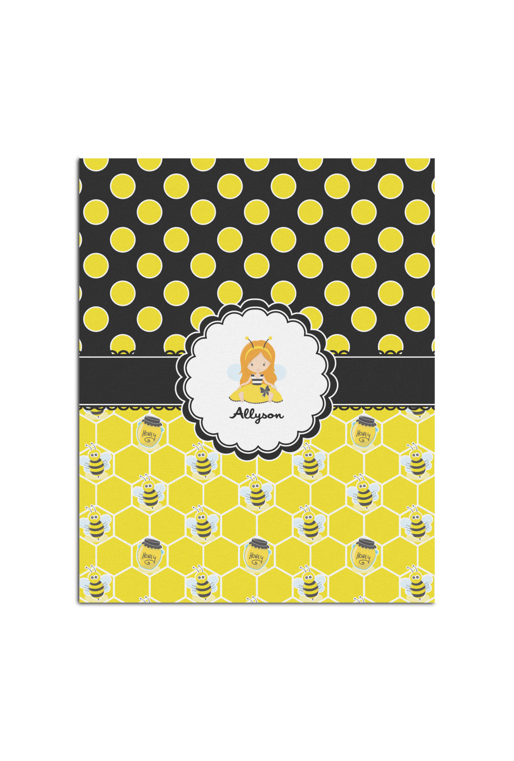 A wide lace black ribbon separates the pattern and connects a beautiful black trimmed white decorative label that provides a focal point for either a little bumble-bee or a bumble-bee obsessed girl and his/her name. As a special touch, personalize your little bumble-bee girl's hair and skin color.
