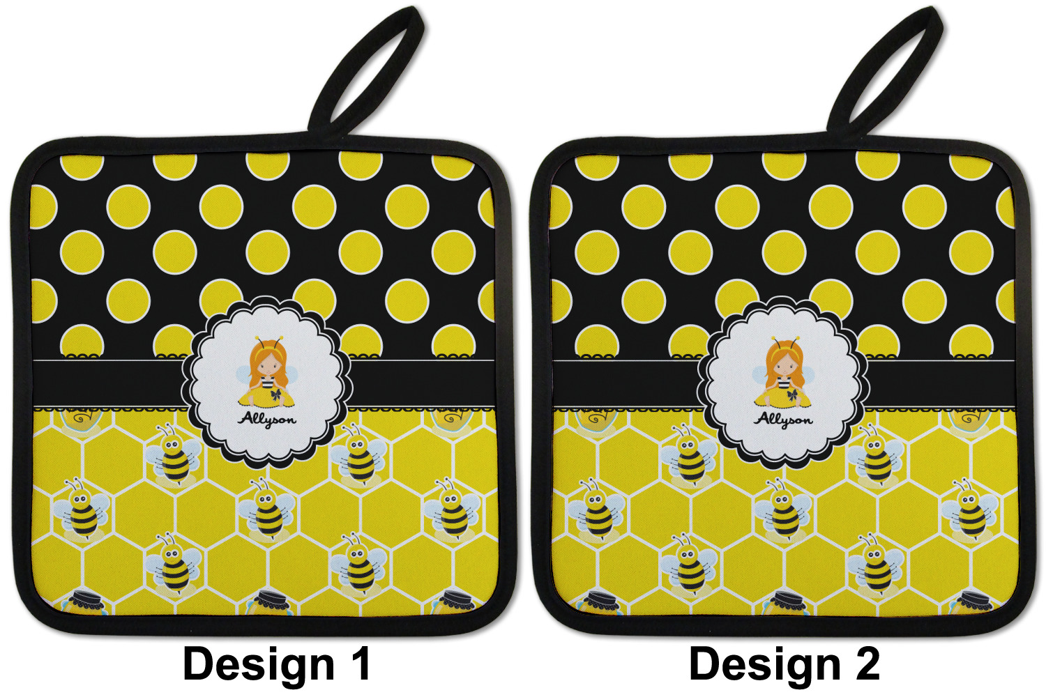 Our personalized pot holders feature a neoprene front that displays your personalization in vibrant colors. The backing of the hot pot holder is rubberized; the textured backing allows you to have a great grip when using this custom pot holder. The two materials are joined with a sleek, black trim, and the holder also includes an attached loop for hanging and storage. The pot holder is approximately 8.75 inches by 8.75 inches and 0.25 inches tall, while the fabric loop is 2.5 inches long. You can purchase a kitchen pot holder by itself or as a set of 2. We also offer a set including one pot holder and one oven mitt.
